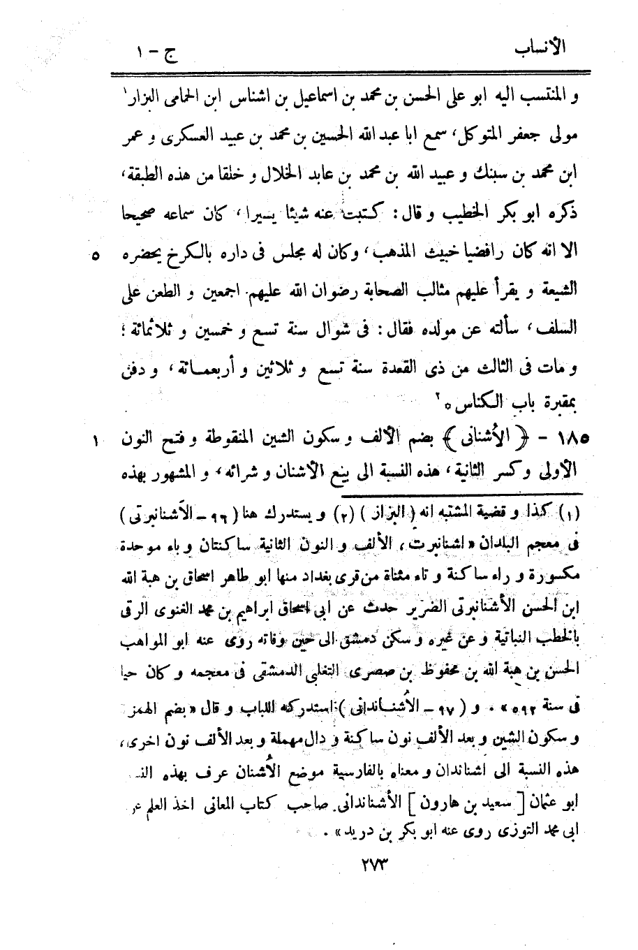 [2] ويستدرك هنا (96- الاشنانبرتى) في معجم البلدان «اشنانبرت، الألف والنون الثانية ساكنتان وباء موحدة مكسورة وراء ساكنة وتاء مثناة من قرى بغداد منها ابو طاهر إسحاق بن هبة الله ابن الحسن الأشنانبرتى الضرير حدث عن ابى إسحاق إبراهيم بن محمد الغنوي الرقى بالخطب النباتية وعن غيره وسكن دمشق الى حين وفاته روى عنه ابو المواهب الحسن بن هبة الله بن محفوظ بن صصريّ التغلبي الدمشقيّ في معجمه وكان حيا في سنة 592» . و (97- الاشناندانى) استدركه اللباب وقال «بضم الهمزة وسكون الشين وبعد الألف نون ساكنة ودال مهملة وبعد الألف نون اخرى، هذه النسبة الى اشناندان ومعناه بالفارسية موضع الأشنان عرف بهذه النسبة ابو عثمان [سعيد بن هارون] الأشنانداني صاحب كتاب المعاني أخذ العلم عن ابى محمد التوزي روى عنه ابو بكر بن دريد» .