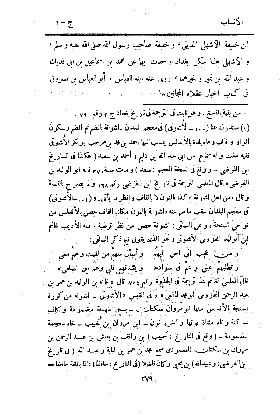 [1] يستدرك هنا (100- الاشوقى) في معجم البلدان «اشوقة بالضم ثم الضم وسكون الواو وقاف وهاء بلدة بالأندلس ينسب اليها احمد بن محمد بن مرحب ابو بكر الاشوقى فقيه مفت وله سماع من ابى عبد الله بن دليم وأحمد بن سعيد (هكذا في تاريخ ابن الفرضيّ- ووقع في نسخة المعجم: سعد) ومات سنة 370 قاله ابو الوليد بن الفرضيّ» قال المعلمي الترجمة في تاريخ ابن الفرضيّ رقم 168 ولم يصرح بالنسبة وقال «من أهل اشونة» كذا بالنون لا بالقاف وانظر ما يأتى. و (101- الاشونى) في معجم البلدان عقب ما مر عنه «اشونة بالنون مكان القاف حصن بالأندلس من نواحي استجة، وعن السافي: اشونة حصن من نظر قرطبة. منه الأديب غانم ابن الوليد المخزومي الأشونى وهو الّذي يقول فيما ذكر السلفي:
