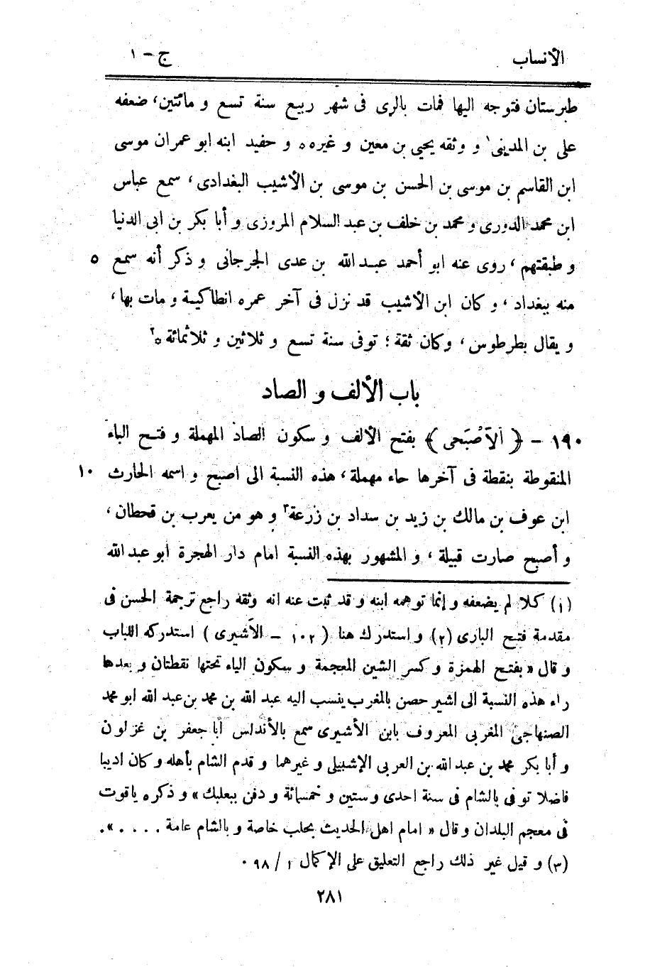 [2] واستدرك هنا (102- الاشيرى) استدركه اللباب وقال «بفتح الهمزة وكسر الشين المعجمة وسكون الياء تحتها نقطتان وبعدها راء هذه النسبة الى أشير حصن بالمغرب ينسب اليه عبد الله بن محمد بن عبد الله ابو محمد الصنهاجى المغربي المعروف بابن الأشيري سمع بالأندلس ابا جعفر بن غزلون وأبا بكر محمد بن عبد الله بن العربيّ الإشبيلي وغيرهما وقدم الشام بأهله وكان أديبا فاضلا توفى بالشام في سنة احدى وستين وخمسمائة ودفن ببعلبكّ» وذكره ياقوت في معجم البلدان وقال «امام أهل الحديث بحلب خاصة وبالشام عامة ... » .