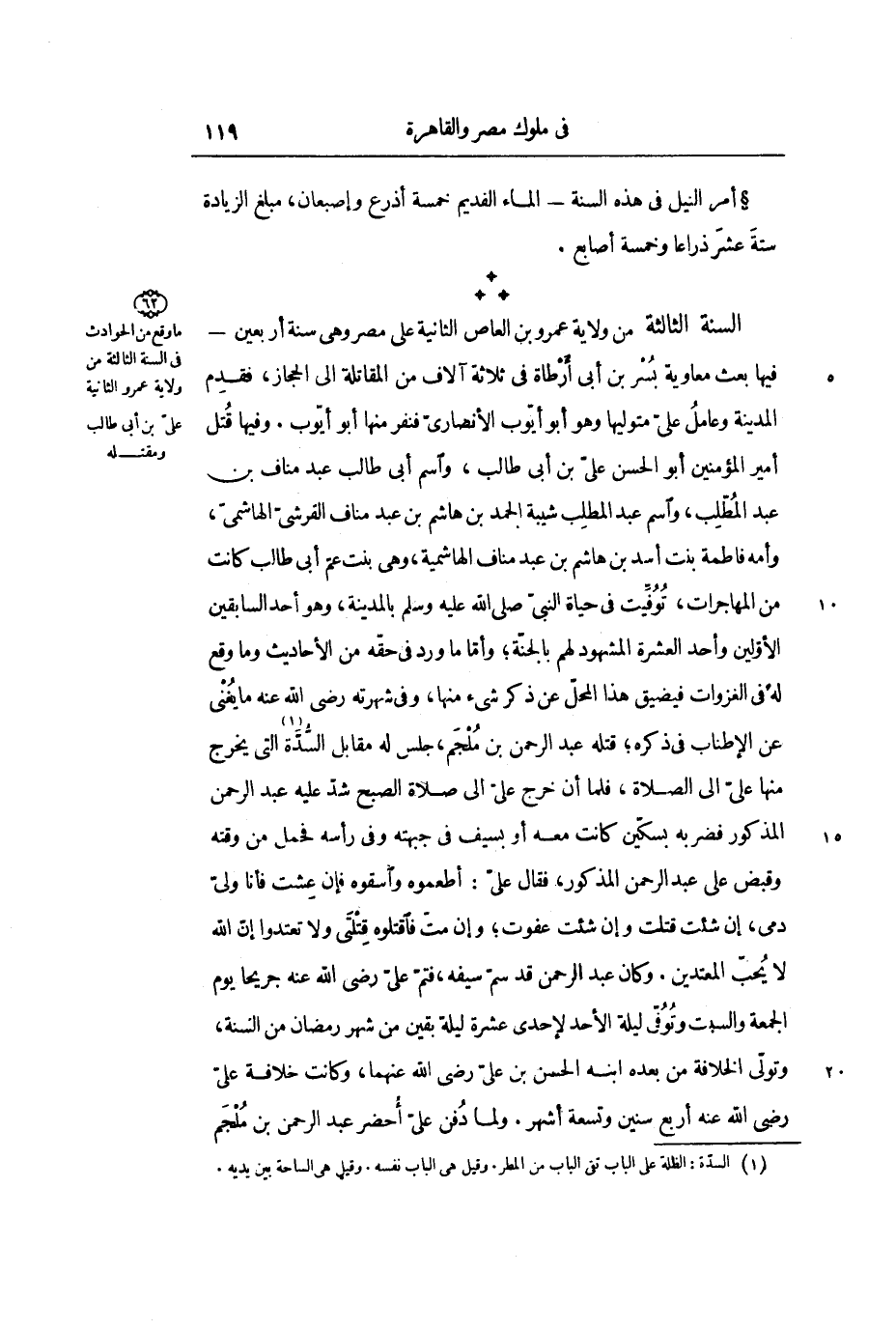 *** السنة الثالثة من ولاية عمرو بن العاص الثانية على مصر وهي سنة أربعين- فيها بعث معاوية بسر بن أبي أرطاة في ثلاثة آلاف من المقاتلة إلى الحجاز، فقدم المدينة وعامل علي متوليها وهو أبو أيوب الأنصاري فنفر منها أبو أيوب. وفيها قتل أمير المؤمنين أبو الحسن علي بن أبي طالب، واسم أبي طالب عبد مناف بن عبد المطلب، واسم عبد المطلب شيبة الجمد بن هاشم بن عبد مناف القرشي الهاشمي، وأمه فاطمة بنت أسد بن هاشم بن عبد مناف الهاشمية، وهي بنت عم أبي طالب كانت من المهاجرات، توفيت في حياة النّبيّ صلى الله عليه وسلم بالمدينة، وهو أحد السابقين الأولين وأحد العشرة المشهود لهم بالجنة؛ وأما ما ورد في حقه من الأحاديث وما وقع له في الغزوات فيضيق هذا المحل عن ذكر شيء منها، وفي شهرته رضي الله عنه ما يغني عن الإطناب في ذكره؛ قتله عبد الرحمن بن ملجم، جلس له مقابل السدة «1» التي يخرج منها علي إلى الصلاة، فلما أن خرج علي إلى صلاة الصبح شد عليه عبد الرحمن المذكور فضربه بسكين كانت معه أو بسيف في جبهته وفي رأسه فحمل من وقته وقبض على عبد الرحمن المذكور، فقال علي: أطعموه واسقوه فإن عشت فأنا ولي دمي، إن شئت قتلت وإن شئت عفوت؛ وإن مت فاقتلوه قتلتي ولا تعتدوا إن الله لا يحب المعتدين. وكان عبد الرحمن قد سم سيفه، فتم علي رضي الله عنه جريحاً يوم الجمعة والسبت وتوفي ليلة الأحد لإحدى عشرة ليلة بقين من شهر رمضان من السنة، وتولى الخلافة من بعده ابنه الحسن بن علي رضي الله عنهما، وكانت خلافة علي رضي الله عنه أربع سنين وتسعة أشهر. ولما دفن علي أحضر عبد الرحمن بن ملجم