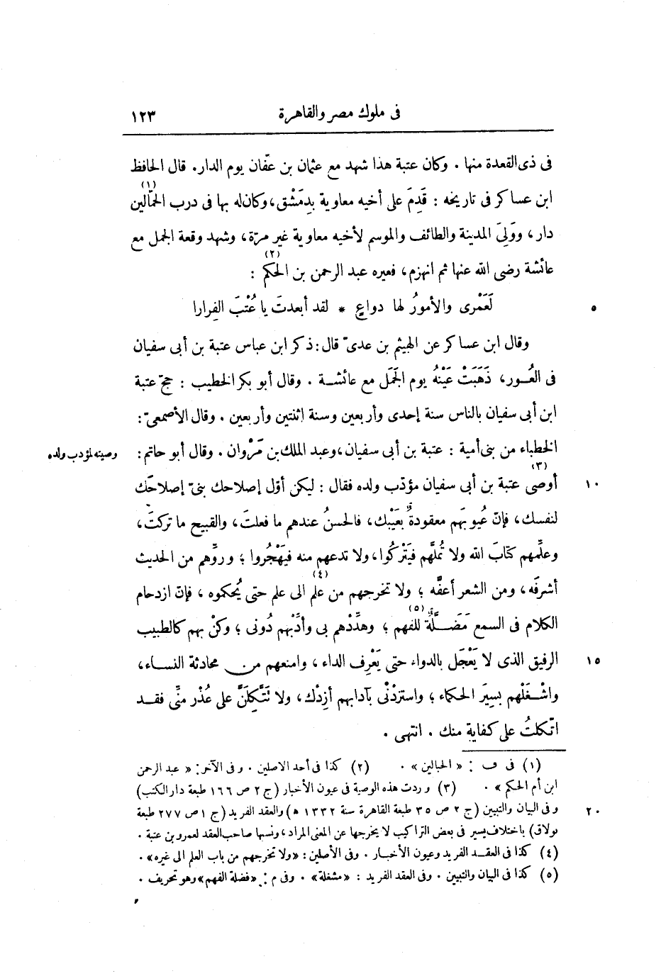 أوصى «3» عتبة بن أبي سفيان مؤدب ولده فقال: ليكن أول إصلاحك بني إصلاحك لنفسك، فإن عيوبهم معقودة بعيبك، فالحسن عندهم ما فعلت، والقبيح ما تركت، وعلمهم كتاب الله ولا تملهم فيتركوا، ولا تدعهم منه فيهجروا؛ وروهم من الحديث أشرفه، ومن الشعر أعفه؛ ولا تخرجهم من علم «4» إلى علم حتى يحكموه، فإن ازدحام الكلام في السمع مضلة للفهم «5» ؛ وهددهم بي وأدبهم دوني؛ وكن بهم كالطبيب الرفيق الذي لا يعجل بالدواء حتى يعرف الداء، وامنعهم من محادثة النساء، واشغلهم بسير الحكماء؛ واستزدني بآدابهم أزدك، ولا تتكلن على عذر مني فقد اتكلت على كفاية منك. انتهى.