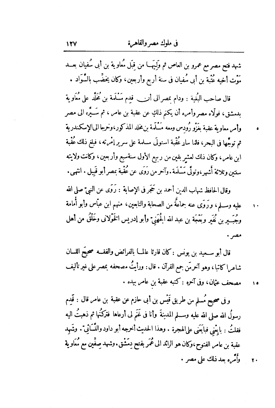 قال صاحب البغية: ودام بمصر إلى أن قدم مسلمة بن مخلد على معاوية بدمشق، فولاه مصر وأمره أن يكتم ذلك عن عقبة بن عامر، ثم سيره إلى مصر وأمر معاوية عقبة بغزو رودس ومعه مسلمة بن مخلد المذكور، وخرجا إلى الإسكندرية ثم توجها في البحر، فلما سار عقبة استولى مسلمة على سرير إمرته، فبلغ ذلك عقبة ابن عامر، وكان ذلك لعشرٍ بقين من ربيع الأول سنة سبع وأربعين، وكانت ولايته سنتين وثلاثة أشهر، وتولى مسلمة. وآخر من روى عن عقبة بمصر أبو قبيل. انتهى.