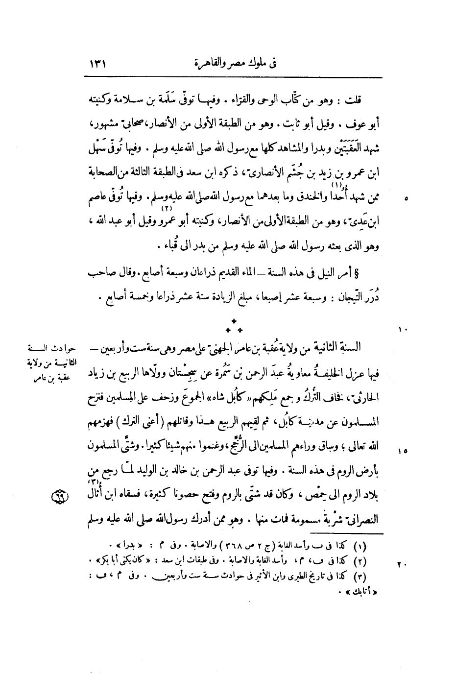 *** السنة الثانية من ولاية عقبة بن عامر الجهني على مصر وهي سنة ست وأربعين- فيها عزل الخليفة معاوية عبد الرحمن بن سمرة عن سجستان وولاها الربيع بن زياد الحارثي، فخاف الترك وجمع ملكهم «كابل شاه» الجموع وزحف على المسلمين فنزح المسلمون عن مدينة كابل، ثم لقيهم الربيع هذا وقاتلهم (أعني الترك) فهزمهم الله تعالى؛ وساق وراءهم المسلمين إلى الرخج، وغنموا منهم شيئاً كثيراً. وشتى المسلمون بأرض الروم في هذه السنة. وفيها توفي عبد الرحمن بن خالد بن الوليد لما رجع من بلاد الروم إلى حمص، وكان قد شتى بالروم وفتح حصوناً كثيرة، فسقاه ابن أثال «3» النصراني شربة مسمومة فمات منها. وهو ممن أدرك رسول الله صلى الله عليه وسلم