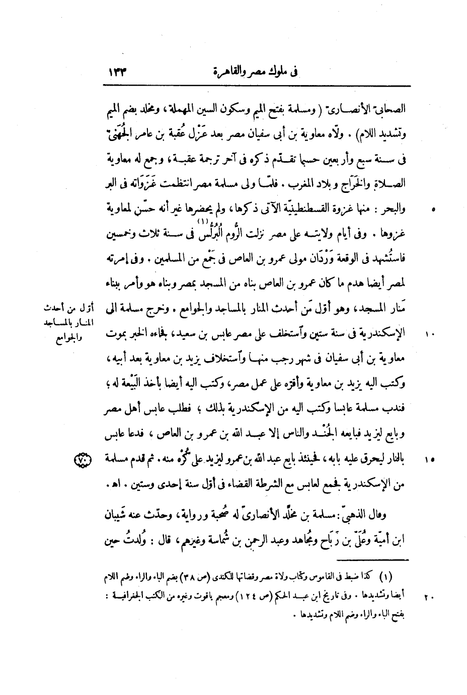 الصحابي الأنصاري (ومسلمة بفتح الميم وسكون السين المهملة، ومخلد بضم الميم وتشديد اللام) . ولاه معاوية بن أبي سفيان مصر بعد عزل عقبة بن عامر الجهني في سنة سبع وأربعين حسبما تقدم ذكره في أخر ترجمة عقبة، وجمع له معاوية الصلاة والخراج وبلاد المغرب. فلما ولي مسلمة مصر انتظمت غزواته في البر والبحر: منها غزوة القسطنطينية الآتي ذكرها، ولم يحضرها غير أنه حسن لمعاوية غزوها. وفي أيام ولايته على مصر نزلت الروم البرلس «1» في سنة ثلاث وخمسين فاستشهد في الوقعة وردان مولى عمرو بن العاص في جمع من المسلمين. وفي إمرته لمصر أيضاً هدم ما كان عمرو بن العاص بناه من المسجد بمصر وبناه هو وأمر ببناء منار المسجد، وهو أول من أحدث المنار بالمساجد والجوامع. وخرج مسلمة إلى الإسكندرية في سنة ستين واستخلف على مصر عابس بن سعيد، فجاءه الخبر بموت معاوية بن أبي سفيان في شهر رجب منها واستخلاف يزيد بن معاوية بعد أبيه، وكتب إليه يزيد بن معاوية وأقره على عمل مصر، وكتب إليه أيضاً بأخذ البيعة له؛ فندب مسلمة عابساً وكتب إليه من الإسكندرية بذلك؛ فطلب عابس أهل مصر وبايع ليزيد فبايعه الجند والناس إلا عبد الله بن عمرو بن العاص، فدعا عابس بالنار ليحرق عليه بابه، فحينئذ بايع عبد الله بن عمرو ليزيد على كره منه. ثم قدم مسلمة من الإسكندرية فجمع لعابس مع الشرطة القضاء في أوّل سنة إحدى وستين. اهـ.