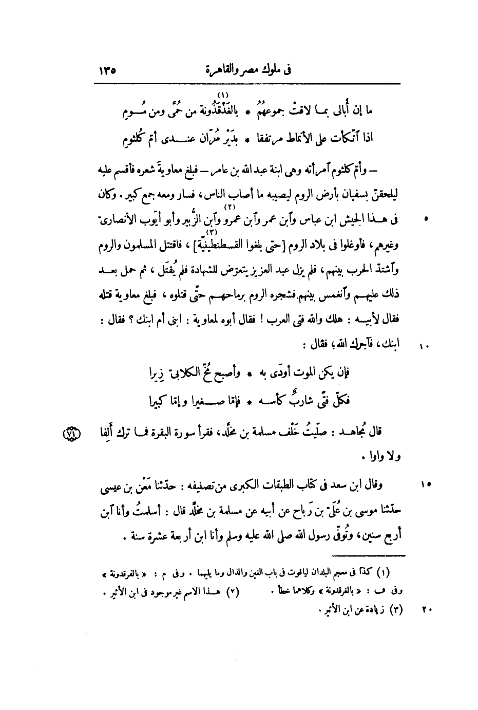 - وأم كلثوم امرأته وهي ابنة عبد الله بن عامر- فبلغ معاوية شعره فأقسم عليه ليلحقن بسفيان بأرض الروم ليصيبه ما أصاب الناس، فسار ومعه جمع كبير. وكان في هذا الجيش ابن عباس وابن عمرو ابن عمرو «2» وابن الزبير وأبو أيوب الأنصاري وغيرهم، فأوغلوا في بلاد الروم [حتى بلغوا القسطنطينية «3» ] ، فاقتتل المسلمون والروم واشتد الحرب بينهم، فلم يزل عبد العزيز يتعرض للشهادة فلم يقتل، ثم حمل بعد ذلك عليهم وانغمس بينهم. فشجره الروم برماحهم حتى قتلوه، فبلغ معاوية قتله فقال لأبيه: هلك والله فتى العرب! فقال أبوه لمعاوية: ابني أم ابنك؟ فقال: