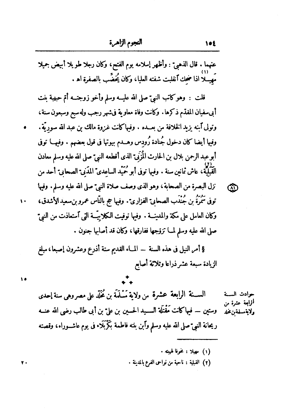 *** السنة الرابعة عشرة من ولاية مسلمة بن مخلد على مصر وهي سنة إحدى وستين- فيها كانت مقتلة السيد الحسين بن علي بن أبي طالب رضي الله عنه ريحانة النبي صلى الله عليه وسلم وابن بنته فاطمة بكربلاء في يوم عاشوراء، وقصته