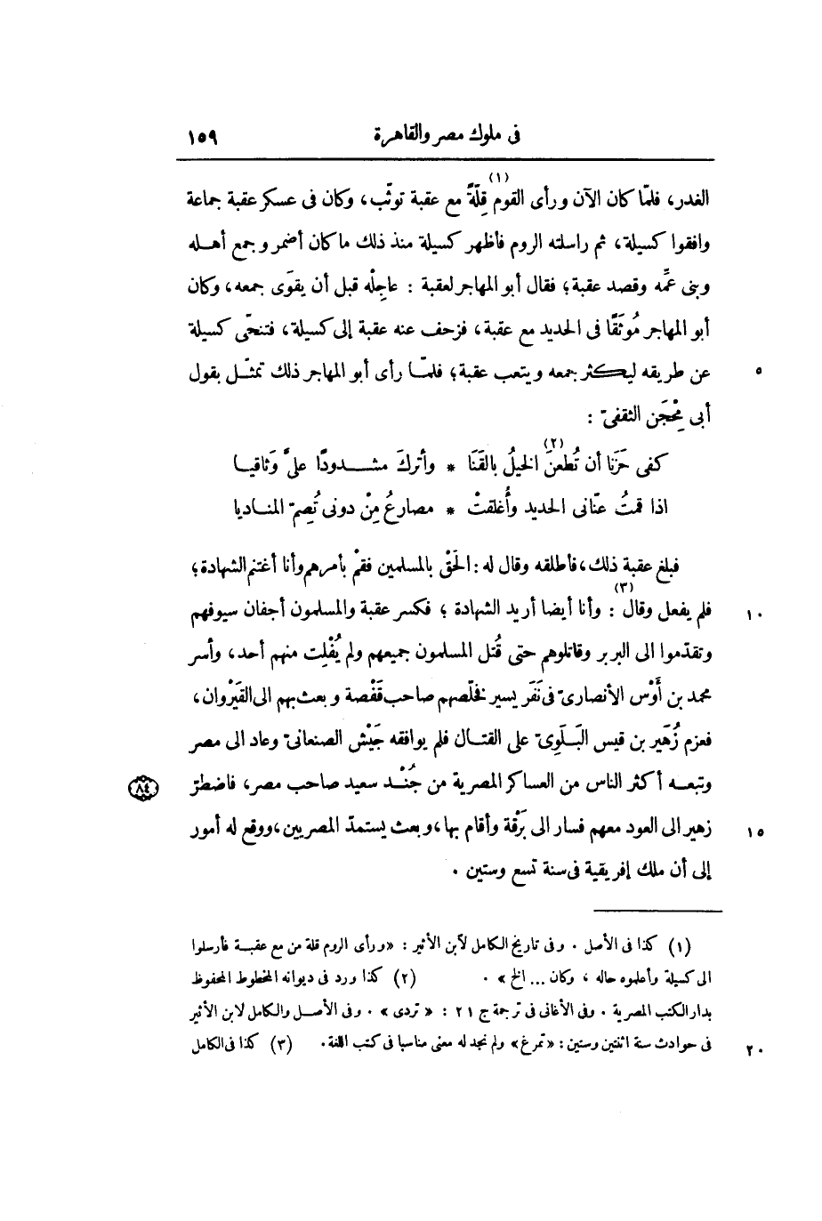 الغدر، فلمّا كان الآن ورأى القوم «1» قلة مع عقبة توثب، وكان في عسكر عقبة جماعة وافقوا كسيلة، ثم راسلته الروم فأظهر كسيلة منذ ذلك ما كان أضمر وجمع أهله وبني عمه وقصد عقبة؛ فقال أبو المهاجر لعقبة: عاجله قبل أن يقوى جمعه، وكان أبو المهاجر موثقاً في الحديد مع عقبة، فزحف عنه عقبة إلى كسيلة، فتنحى كسيلة عن طريقه ليكثر جمعه ويتعب عقبة؛ فلما رأى أبو المهاجر ذلك تمثل بقول أبي محجن الثقفىّ: