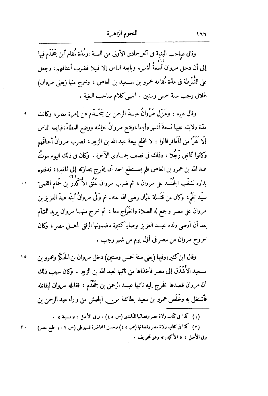 وقال غيره: وعزل مروان عبد الرحمن بن جحدم عن إمرة مصر، وكانت مدة ولايته عليها تسعة أشهر وأياماً، وفتح مروان خزائنه ووضع العطاء، فبايعه الناس إلا نفراً من المعافر قالوا: لا نخلع بيعة عبد الله بن الزبير، فضرب مروان أعناقهم وكانوا ثمانين رجلاً، وذلك في نصف جمادى الآخرة. وكان في ذلك اليوم موت عبد الله بن عمرو بن العاص فلم يستطع أحد أن يخرج بجنازته إلى المقبرة، فدفنوه بداره لشغب الجند على مروان، ثم ضرب مروان عنق الأكدر «2» بن حمام اللخمي سيد لخم، وكان من قتلة عثمان رضي الله عنه، ثم ولى مروان ابنه عبد العزيز بن مروان على مصر وجمع له الصلاة والخراج معاً، ثم خرج منها مروان يريد الشأم بعد أن أوصى ولده عبد العزيز بوصايا كثيرة مضمونها الرفق بأهل مصر، وكان خروج مروان من مصر في أول يوم من شهر رجب.