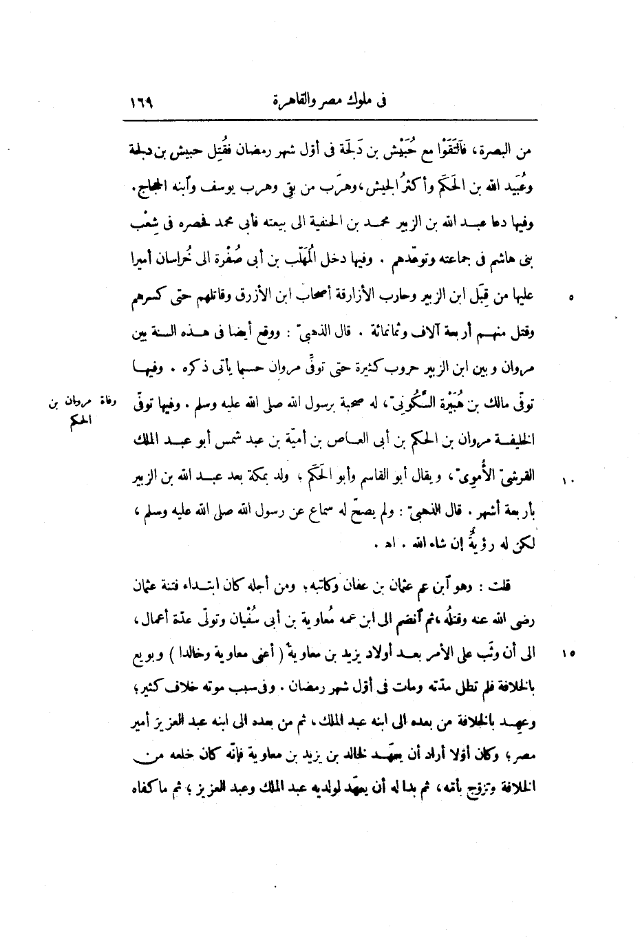 قلت: وهو ابن عم عثمان بن عفان وكاتبه؛ ومن أجله كان ابتداء فتنة عثمان رضي الله عنه وقتله، ثم انضم إلى ابن عمه معاوية بن أبي سفيان وتولى عدة أعمال، إلى أن وثب على الأمر بعد أولاد يزيد بن معاوية (أعني معاوية وخالداً) وبويع بالخلافة فلم تطل مدته ومات في أول شهر رمضان. وفي سبب موته خلاف كثير؛ وعهد بالخلافة من بعده إلى ابنه عبد الملك، ثم من بعده إلى ابنه عبد العزيز أمير مصر؛ وكان أولاً أراد أن يعهد لخالد بن يزيد بن معاوية فإنه كان خلعه من الخلافة وتزوج بأمه، ثم بدا له أن يعهد لولديه عبد الملك وعبد العزيز؛ ثم ما كفاه