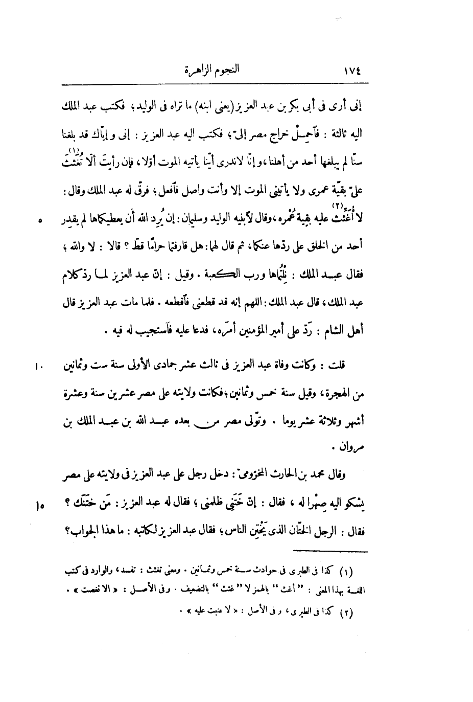إني أرى في أبي بكر بن عبد العزيز (يعني ابنه) ما تراه في الوليد؛ فكتب عبد الملك إليه ثالثة: فاحمل خراج مصر إلي؛ فكتب إليه عبد العزيز: إني وإياك قد بلغنا سناً لم يبلغها أحد من أهلنا، وإنا لا ندري أينا يأتيه الموت أوّلا، فإن رأيت ألّا تغثث «1» علي بقية عمري ولا يأتيني الموت إلا وأنت واصل فافعل؛ فرق له عبد الملك وقال:
