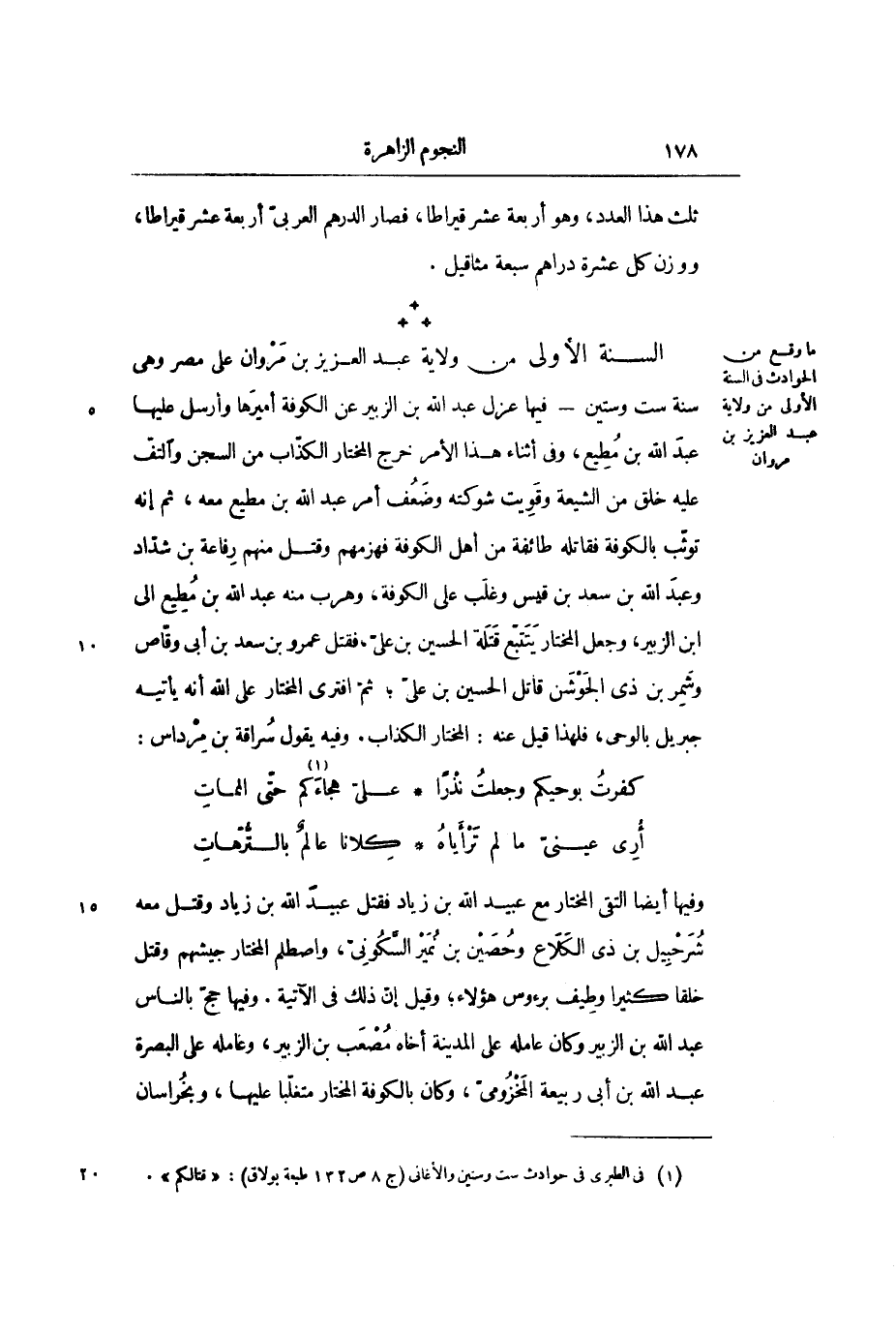 *** السنة الأولى من ولاية عبد العزيز بن مروان على مصر وهي سنة ست وستين- فيها عزل عبد الله بن الزبير عن الكوفة أميرها وأرسل عليها عبد الله بن مطيع، وفي أثناء هذا الأمر خرج المختار الكذاب من السجن والتف عليه خلق من الشيعة وقويت شوكته وضعف أمر عبد الله بن مطيع معه، ثم إنه توثب بالكوفة فقاتله طائفة من أهل الكوفة فهزمهم وقتل منهم رفاعة بن شداد وعبد الله بن سعد بن قيس وغلب على الكوفة، وهرب منه عبد الله بن مطيع إلى ابن الزبير، وجعل المختار يتتبع قتلة الحسين بن علي، فقتل عمرو بن سعد بن أبي وقاص وشمر بن ذي الجوشن قاتل الحسين بن علي؛ ثم افترى المختار على الله أنه يأتيه جبريل بالوحي، فلهذا قيل عنه: المختار الكذاب. وفيه يقول سراقة بن مرداس: