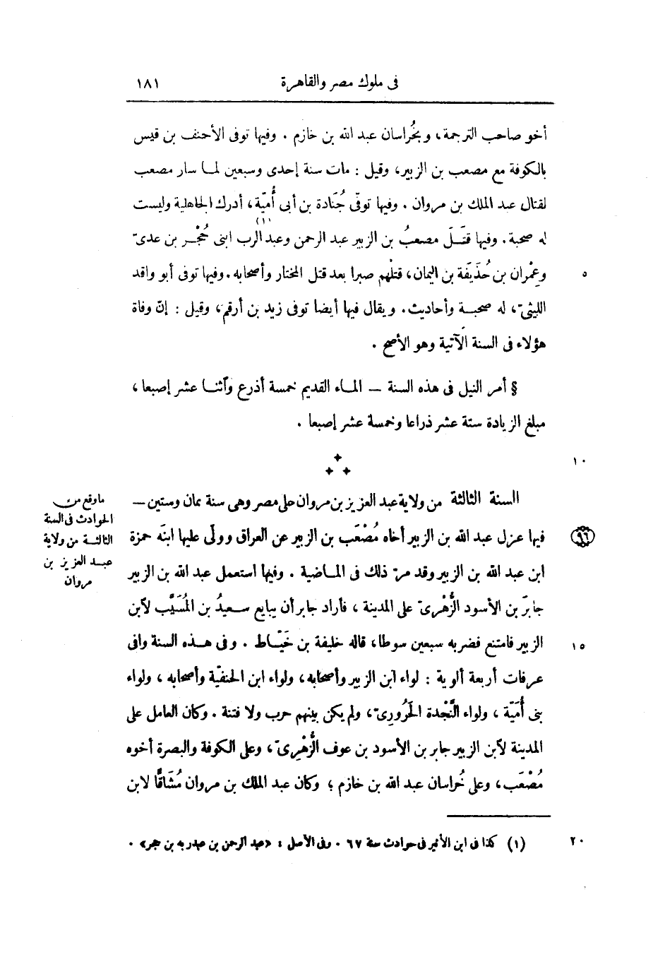*** السنة الثالثة من ولاية عبد العزيز بن مروان على مصر وهي سنة ثمان وستين- فيها عزل عبد الله بن الزبير أخاه مصعب بن الزبير عن العراق وولي عليها ابنه حمزة ابن عبد الله بن الزبير وقد مر ذلك في الماضية. وفيها استعمل عبد الله بن الزبير جابر بن الأسود الزهري على المدينة، فأراد جابر أن يبايع سعيد بن المسيب لابن الزبير فامتنع فضربه سبعين سوطاً، قاله خليفة بن خياط. وفي هذه السنة وافى عرفات أربعة ألوية: لواء ابن الزبير وأصحابه، ولواء ابن الحنفية وأصحابه، ولواء بني أمية، ولواء النجدة الحروري، ولم يكن بينهم حرب ولا فتنة. وكان العامل على المدينة لابن الزبير جابر بن الأسود بن عوف الزهري، وعلى الكوفة والبصرة أخوه مصعب، وعلى خراسان عبد الله بن خازم؛ وكان عبد الملك بن مروان مشاقّا لابن