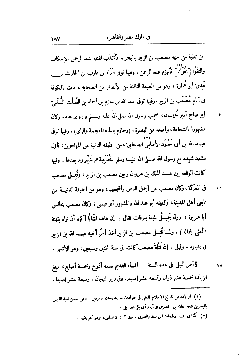 ابن ثعلبة من جهة مصعب بن الزبير بالبحر، فانتدب لقتله عبد الرحمن الإسكاف والتقوا [بجواثا «1» ] فانهزم عبد الرحمن. وفيها توفي البراء بن عازب بن الحارث بن عدي أبو عمارة، وهو من الطبقة الثالثة من الأنصار من الصحابة، مات بالكوفة في أيام مصعب بن الزبير. وفيها توفي عبد الله بن خازم بن أسماء بن الصلت السلمي أبو صالح أمير خراسان، صحب رسول الله صلى الله عليه وسلم وروى عنه، وكان مشهوراً بالشجاعة، وأصله من البصرة. (وخازم بالخاء المعجمة والزاي) . وفيها توفي عبد الله بن أبي حدرد الأسلمي «2» الصحابي، من الطبقة الثانية من المهاجرين، فأول مشهد شهده مع رسول الله صلى الله عليه وسلم الحديبية ثم خيبر وما بعدها. وفيها كانت الوقعة بين عبد الملك بن مروان وبين مصعب بن الزبير، وقتل مصعب في المعركة، وكان مصعب من أجمل الناس وأشجعهم، وهو من الطبقة الثانية من تابعي أهل المدينة، وكنيته أبو عبد الله والمشهور أبو عيسى، وكان مصعب يجالس أبا هريرة؛ ورآه جميل بثينة بعرفات فقال: إن هاهنا لشابا أكره أن تراه بثينة (أعني لجماله) . ولما قتل مصعب بن الزبير أخذ أمر أخيه عبد الله بن الزبير في إدباره. وقيل: إن قتلة مصعب كانت في سنة اثنتين وسبعين، وهو الأشهر.