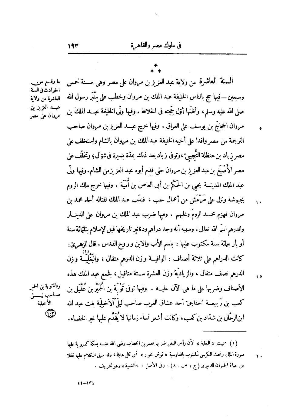 *** السنة العاشرة من ولاية عبد العزيز بن مروان على مصر وهي سنة خمس وسبعين- فيها حج بالناس الخليفة عبد الملك بن مروان وخطب على منبر رسول الله صلى الله عليه وسلم، وأظنها أول حجته في الخلافة. وفيها ولى الخليفة عبد الملك بن مروان الحجاج بن يوسف على العراق. وفيها خرج عبد العزيز بن مروان صاحب الترجمة من مصر وافداً على أخيه الخليفة عبد الملك بن مروان بالشام واستخلف على مصر زياد بن حنظلة التجيبي، وتوفي زياد بعد ذلك بمدة يسيرة في شوال؛ وتخلف على مصر الأصبغ بن عبد العزيز بن مروان حتى قدم أبوه عبد العزيز من الشام. وفيها ولى عبد الملك المدينة يحيى بن الحكم بن أبي العاص بن أمية. وفيها خرج ملك الروم بجيوشه ونزل على مرعش من أعمال حلب، فندب عبد الملك لقتاله أخاه محمد بن مروان فهزم محمد الروم وغلبهم. وفيها ضرب عبد الملك بن مروان على الدينار والدرهم اسم الله تعالى، وسببه أنه وجد دراهم ودنانير تاريخها قبل الإسلام بثلاثمائة سنة أو بأربعمائة سنة مكتوب عليها: باسم الأب والابن وروح القدس. قال الزهري: