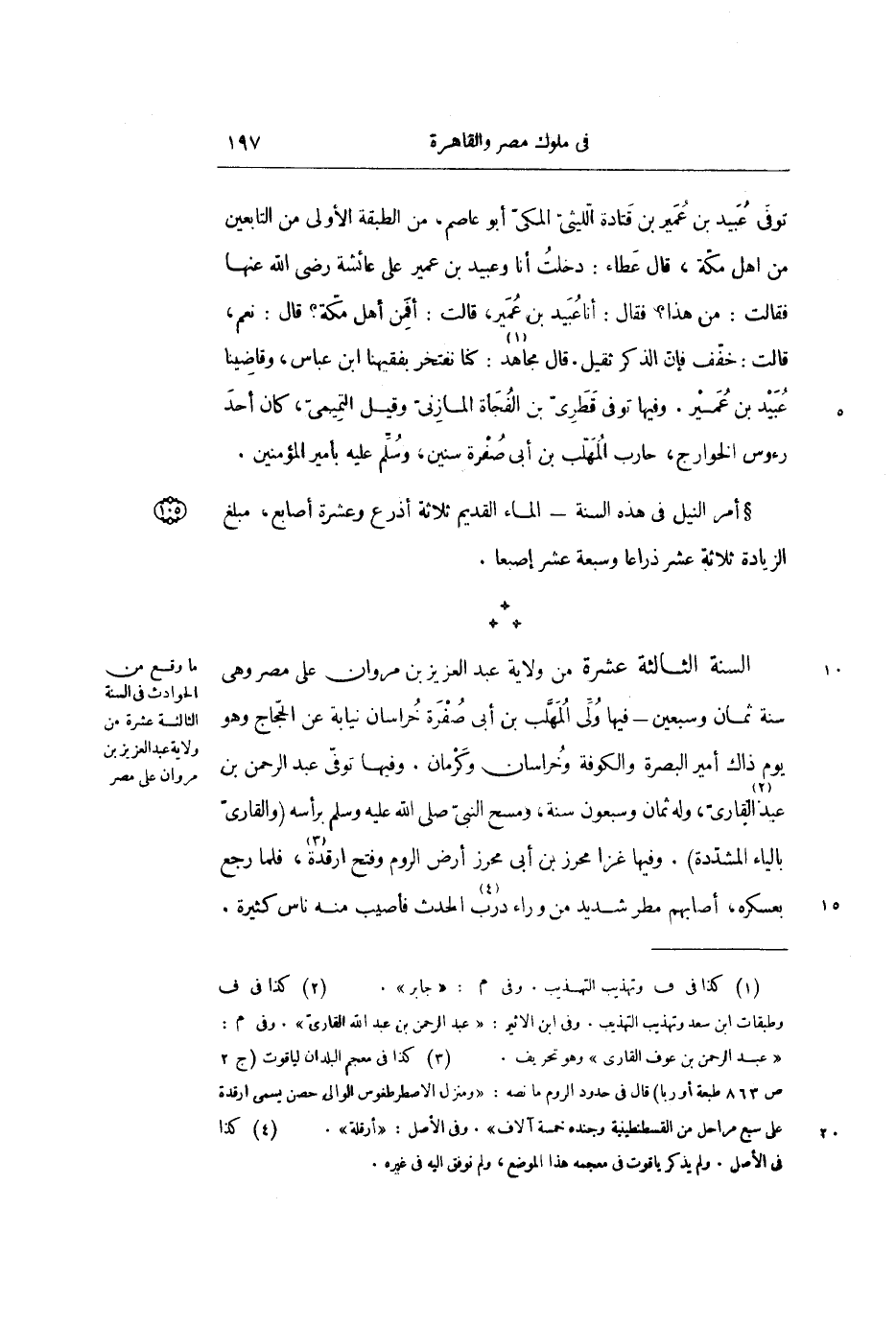 *** السنة الثالثة عشرة من ولاية عبد العزيز بن مروان على مصر وهي سنة ثمان وسبعين- فيها ولي المهلب بن أبي صفرة خراسان نيابة عن الحجاج وهو يوم ذاك أمير البصرة والكوفة وخراسان وكرمان. وفيها توفي عبد الرحمن بن عبد «2» القاري، وله ثمان وسبعون سنة، ومسح النبي صلى الله عليه وسلم برأسه (والقاري بالياء المشددة) . وفيها غزا محرز بن أبي محرز أرض الروم وفتح ارقدة «3» ، فلما رجع بعسكره، أصابهم مطر شديد من وراء درب «4» الحدث فأصيب منه ناس كثيرة.