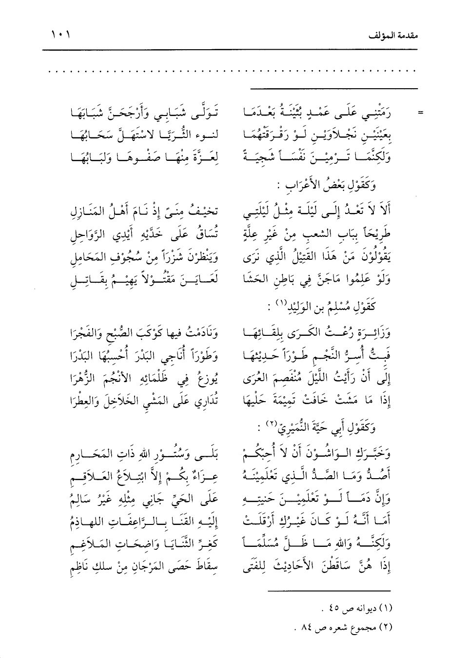 أَلَا لَا تَعْدُ إِلَى لَيْلَة مِثْلُ لَيْلَتِي ... تخيْفُ مِنًى إِذْ نَامَ أَهْلُ المَنَازِلِ