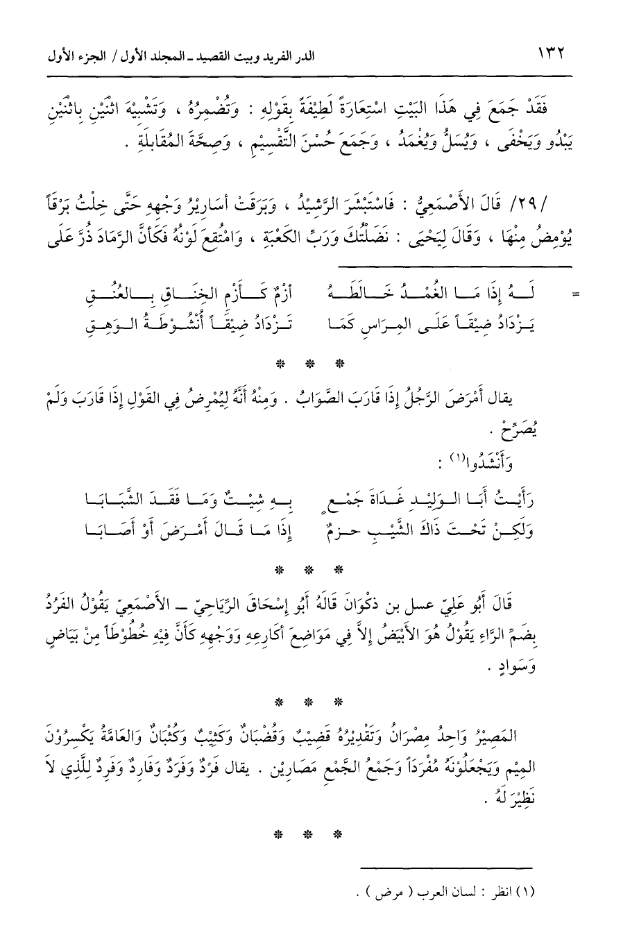 يقال أَمْرَضَ الرَّجُلُ إِذَا قَارَبَ الصَّوَابُ. وَمِنْهُ أَنَّهُ لِيُمْرِضُ فِي القَوْلِ إِذَا قَارَبَ وَلَمْ يُصَرِّحْ.