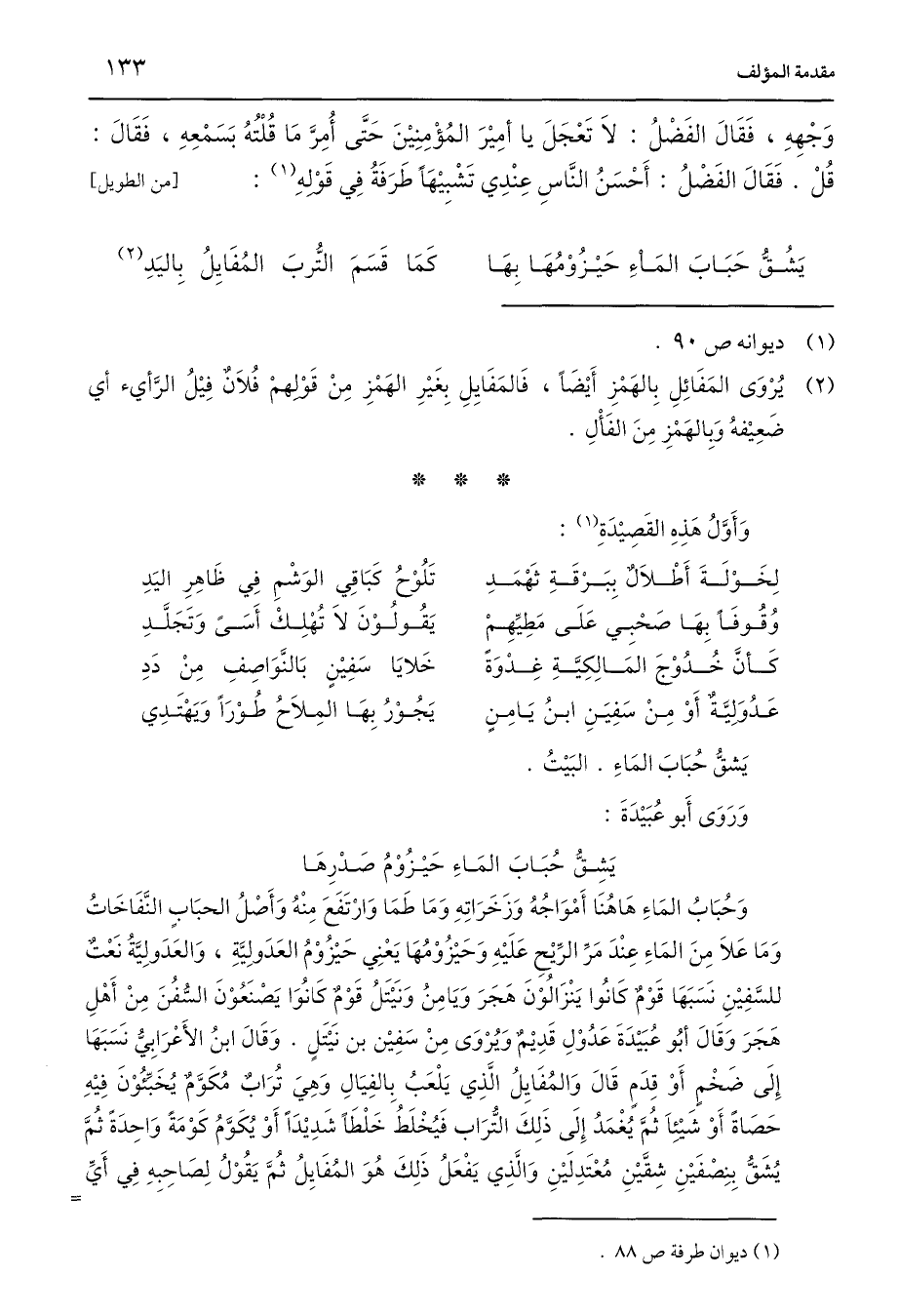 وَحُبَابُ المَاءِ هَاهُنَا أَمْوَاجُهُ وَزَخَرَاتِهِ وَمَا طَمَا وَارْتَفَعَ مِنْهُ وَأَصْلُ الحبَابٍ النَّفَاخَاتُ وَمَا عَلَا مِنَ المَاءِ عِنْدَ مَرِّ الرِّيْحِ عَلَيْهِ وَحَيْزُوْمُهَا يَعْنِي حَيْزُوْمُ العَدَولِيَّةِ، وَالعَدَولِيَّةُ نَعْتٌ للسَّفِيْنِ نَسَبَهَا قَوْمٌ كَانُوا يَنْزَالُوْنَ هَجَرَ وَيَامِنُ وَنَيْتَلُ قَوْمٌ كَانُوا يَصْنَعُوْنَ السُّفُنَ مِنْ أَهْلِ هَجَرَ وَقَالَ أَبُو عُبَيْدَةَ عَدُوْلِ قَدِيْمٌ وَيُرْوَى مِنْ سَفِيْن بن نَيْتَلٍ. وَقَالَ ابْنُ الأَعْرَابِيُّ نَسَبَهَا إِلَى ضَخْمٍ أَوْ قِدَمٍ قَالَ وَالمُفَايِلُ الَّذِي يَلْعَبُ بِالفِيَالِ وَهِيَ تُرَابٌ مُكَوَّمٌ يُخَبِّئُوْنَ فِيْهِ حَصَاةً أَوْ شَيْئًا ثُمَّ يُغْمَدُ إِلَى ذَلِكَ التُّرَاب فَيُخْلَطُ خَلْطًا شَدِيدًا أَوْ يُكَوَّمُ كَوْمَةً وَاحِدَةً ثُمَّ يُشَقُّ بِنِصفَيْنِ شِقَّيْنِ مُعْتَدِلَيْنِ وَالَّذِي يَفْعَلُ ذَلِكَ هُوَ المُفَايِلُ ثُمَّ يَقُوْلُ لِصاحِبِهِ فِي أَيِّ =
