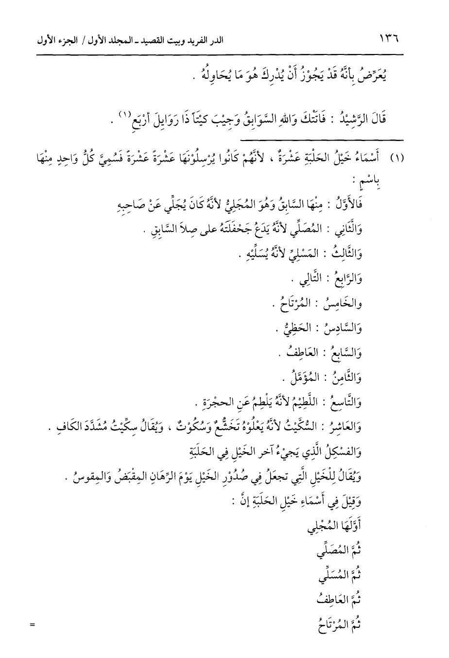 (¬1) أَسْمَاءُ خَيْلُ الحَلْبَةِ عَشْرَةٌ، لأنَّهُمْ كَانُوا يُرْسِلُوْنَهَا عَشْرَةً عَشْرَةً فَسُمِىَّ كُلُّ وَاحِدٍ مِنْهَا بِاسْمٍ: