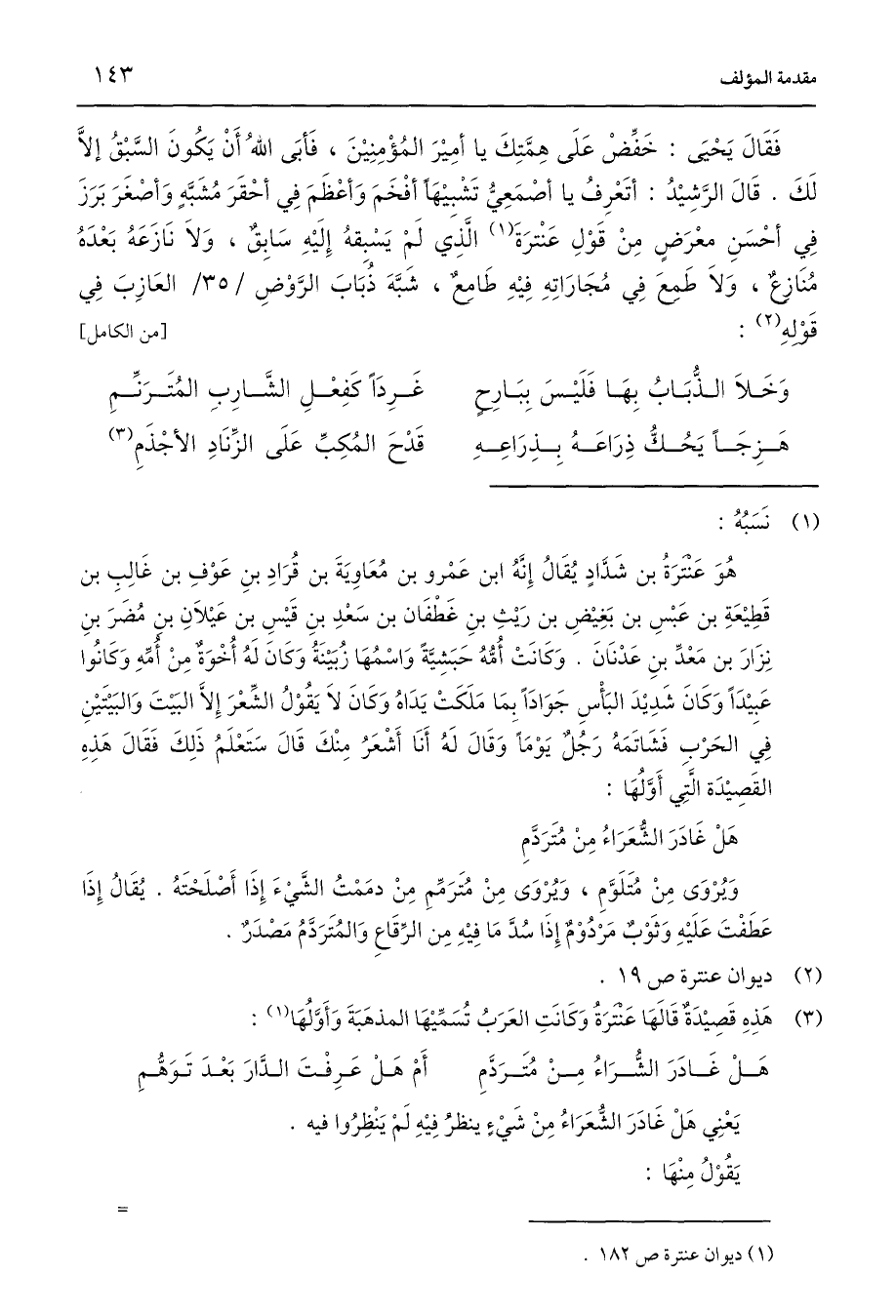 (¬3) هَذِهِ قَصِيْدَةٌ قَالَهَا عَنْتَرَةُ وَكَانَتِ العَرَبُ تُسَمِّيْهَا المذهَبَةَ وَأَوَّلُهَا (1):