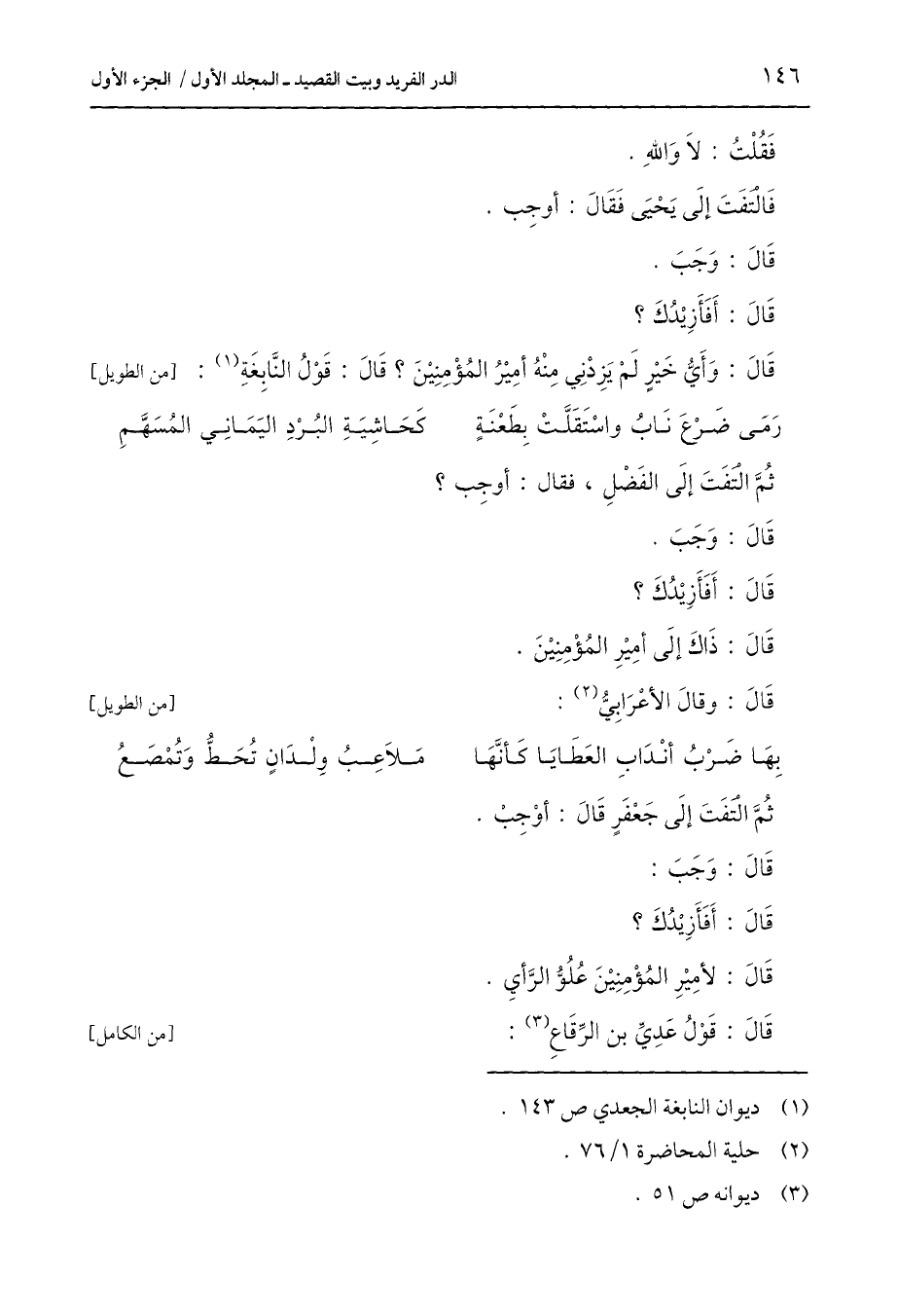 قَالَ: وَأَيُّ خَيْرٍ لَمْ يَزِدْنِي مِنْهُ أمِيْرُ المُؤْمِنِيْنَ؟ قَالَ: قَوْلُ النَّابِغَةِ (¬1): [من الطويل]