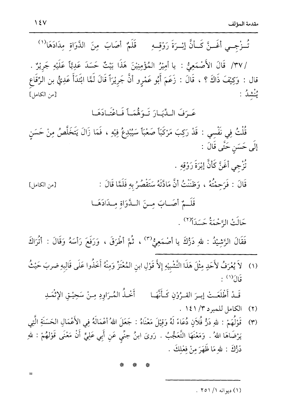 قَالَ الأَصْمَعِيُّ: يا أمِيْرُ المُؤْمِنِيْنَ هَذَا بَيْتٌ حَسَدَ عَدِيًّا عَلَيْهِ جَرِيْرٌ. قال: وَكِيْفَ ذَاكَ؟ ، قَالَ: زَعَمَ أَبُو عَمْرٍو أنَّ جَرِيْرًا قَالَ لَمَّا ابْتَدَأَ عَدِيُّ بن الرِّقَاعِ يُنشِد: [من الكامل]