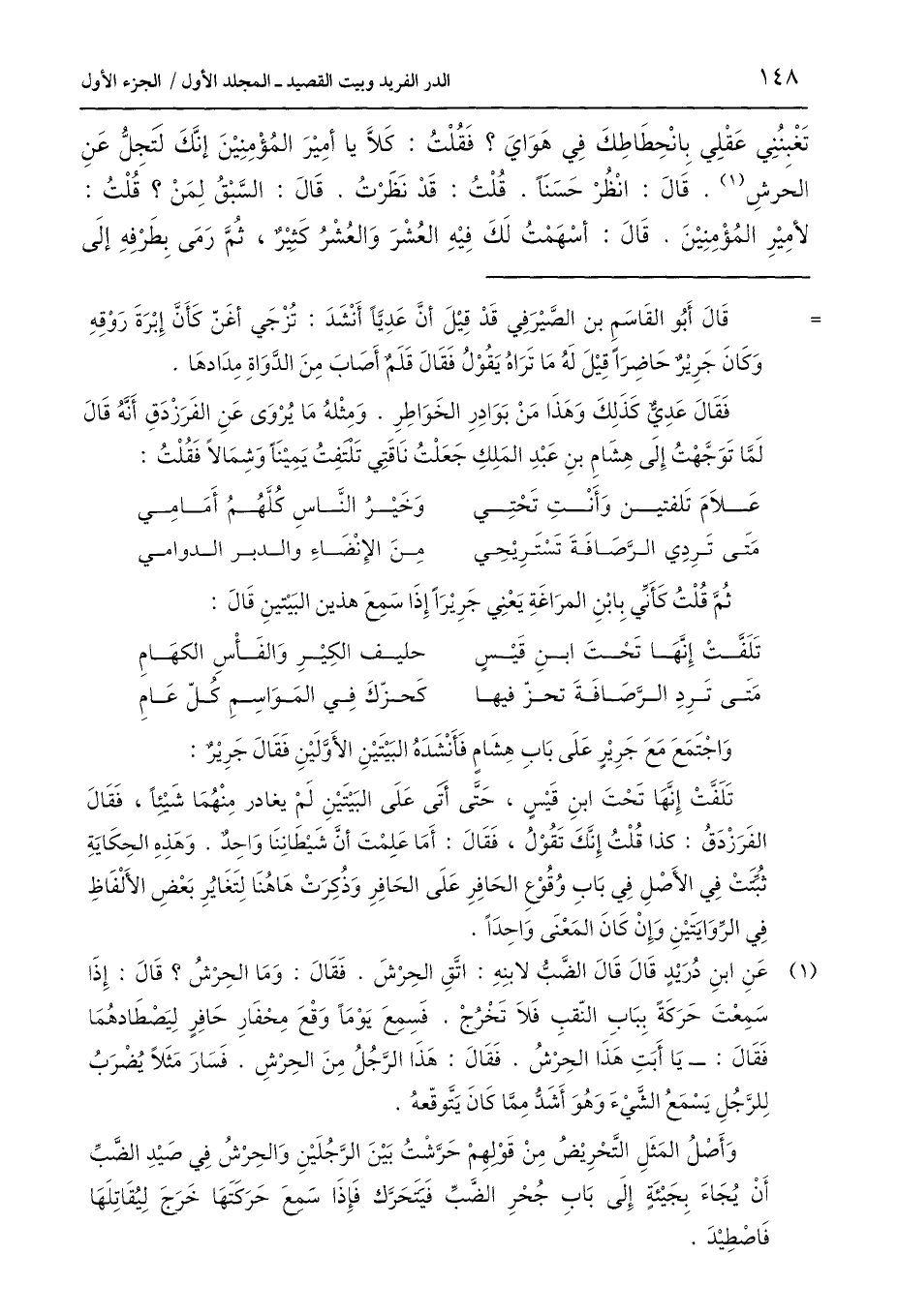 = قَالَ أَبُو القَاسَمِ بن الصَّيْرَفِي قَدْ قِيْلَ أنَّ عَدِيًّا أَنْشَدَ: تُزْجَي أغَنّ كَأَنَّ إِبْرَةَ رَوْقِهِ وَكَانَ جَرِيْرٌ حَاضِرًا قِيْلَ لَهُ مَا تَرَاهُ يَقُوْلُ فَقَالَ قَلَمٌ أَصَابَ مِنَ الدَّوَاةِ مِدَادهَا.