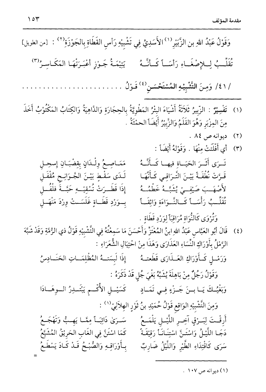 (¬4) قَالَ أَبُو العَبَّاسِ عَبْدُ اللَّهِ ابْنُ المُعْتَزِّ وَأَحْسَنَ مَا سَمِعْتُهُ فِي التَّشْبِيْهِ قَوْلُ ذي الرُّمَّةِ وَقَدْ شَبَّهَ الرَّمْلُ بِأَوْرَاكِ النِّسَاءِ العَذَارَى وَهَذَا مِنْ احْتِيَالِ الشُّعَرَاءِ: