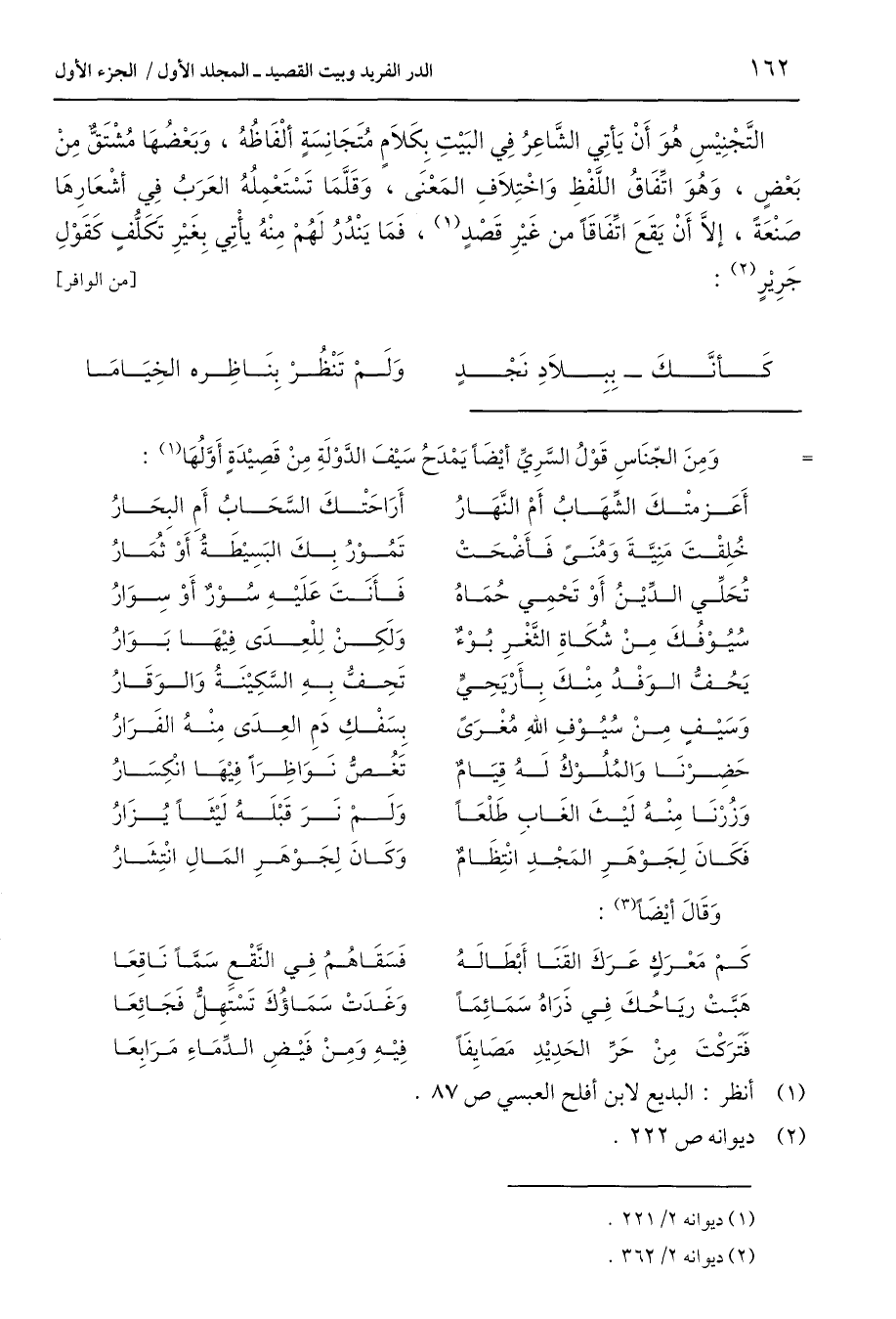 = وَمِنَ الجّنَاسِ قَوْلُ السَّرِيِّ أَيْضًا يَمْدَحُ سَيْفَ الدَّوْلَةِ مِنْ قَصِيْدَةٍ أَوَّلُهَا (1):