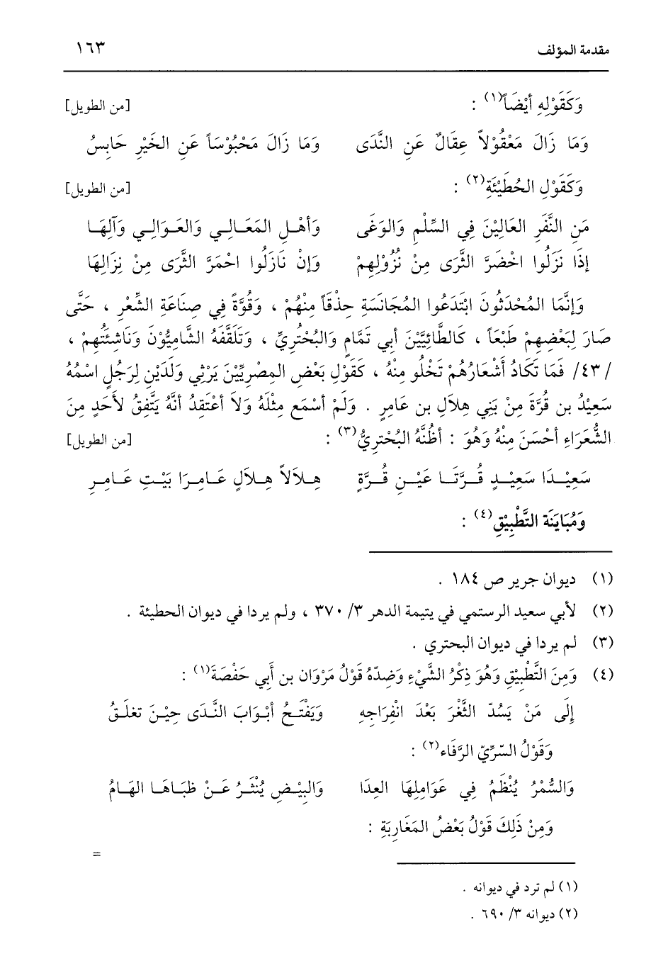 وَإِنَّمَا المُحْدَثُونَ ابْتَدَعُوا المُجَانَسَةِ حِذْقًا مِنْهُمْ، وَقُوَّةً فِي صِنَاعَةِ الشِّعْرِ، حَتَّى صَارَ لِبَعْضِهِمْ طَبْعًا، كَالطَّائِيَّيْنَ أبِي تَمَّامٍ وَالبُحْتُرِيِّ، وَتَلَقَّفَهُ الشَّامِيُّوْنَ وَنَاشِئَتُهِمْ، فَمَا تَكَادُ أَشْعَارُهُمْ تَخْلُو مِنْهُ، كقَوْلِ بَعْضِ المِصْرِيِّيْنَ يَرْثِي وَلَدَيْنِ لِرَجُلٍ اسْمُهُ سَعِيْدُ بن قُرَّةَ مِنْ بَنِي هِلَالِ بن عَامِرٍ. وَلَمْ أسْمَع مِثْلَهُ وَلَا أعْتَقِدُ أنَّهُ يَتَّفِقُ لأَحَدٍ مِنَ الشُّعَرَاءِ أحْسَنَ مِنْهُ وَهُوَ: أظُنَّهُ البُحْترِيُّ (¬3): [من الطويل]