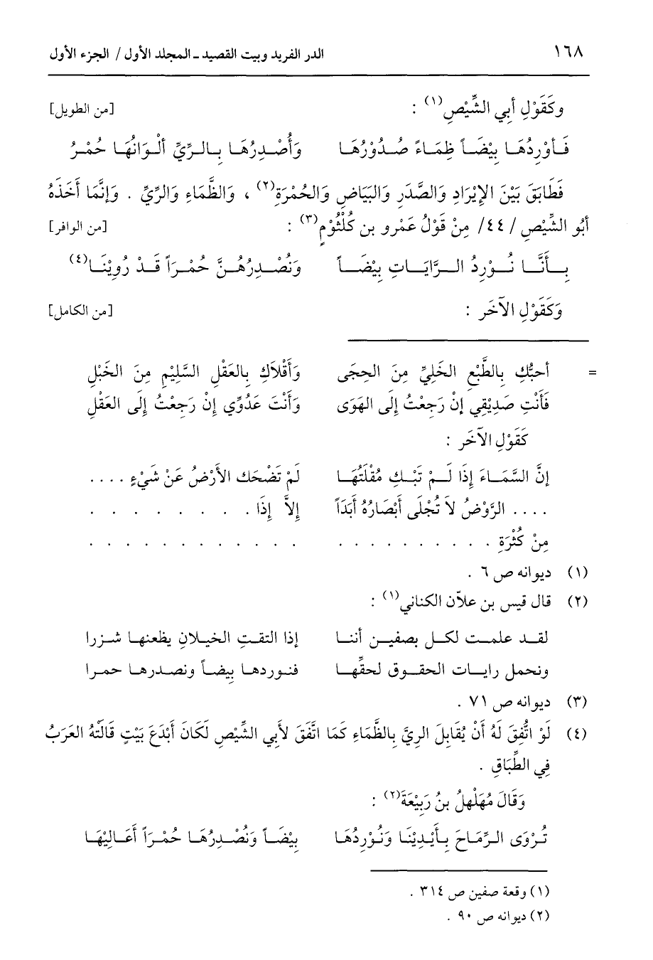 فَطَابَقَ بَيْنَ الإِيْرَادِ وَالصَّدَرِ وَالبَيَاضِ وَالحُمْرَةِ (¬2)، وَالظَّمَاءِ وَالرِّيِّ. وَإِنَّمَا أَخَذَهُ أَبُو الشِّيْصِ مِنْ قَوْلُ عَمْرو بن كُلْثُوْمٍ (¬3): [من الوافر]