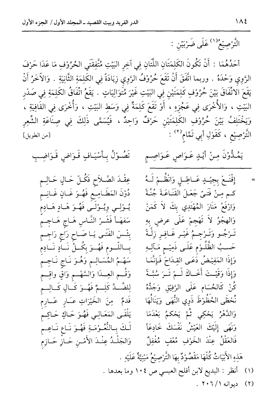 أحَدُهُمَا: أَنْ تَكُونَ الكَلِمَتَانِ اللَّتَانِ فِي آخِرِ البَيْتِ مُتَّفِقَتَي الحُرُوْفِ مَا عَدَا حَرْفَ الرَّوِي وَحْدَهُ. وربما اتَّفَقَ أَنْ تَقَعَ حُرُوْفُ الرَّوِي زِيَادَةً فِي الكَلِمَةِ الثَّانِيَةِ. وَالآخَرُ أَنْ يَقَعَ الاتِّفَاقَ بَيْنَ حُرُوْفِ كَلِمَتَيْنِ فِي البَيْتِ غَيْرَ مُتَوَالِيَاتٍ. يَقَعُ اتِّفَاقُ الكَلِمَةِ فِي صَدْرِ البَيْتِ، وَالأُخْرَى فِي عَجُزِهِ، أَوْ تَقَعَ كَلِمَةٌ فِي وَسَطِ البَيْتِ، وَأُخْرَى فِي القَافِيَةِ، وَيَخْتَلِفُ بَيْنَ حُرُوْفِ الكَلِمَتَيْنِ حَرْفٌ وَاحِدٌ، فَيُسَمَّى ذَلِكَ فِي صنَاعَةِ الشِّعِرِ التَّرْصِيْعِ، كَقَوْلِ أبِي تَمَّامٍ (¬2): [من الطويل]