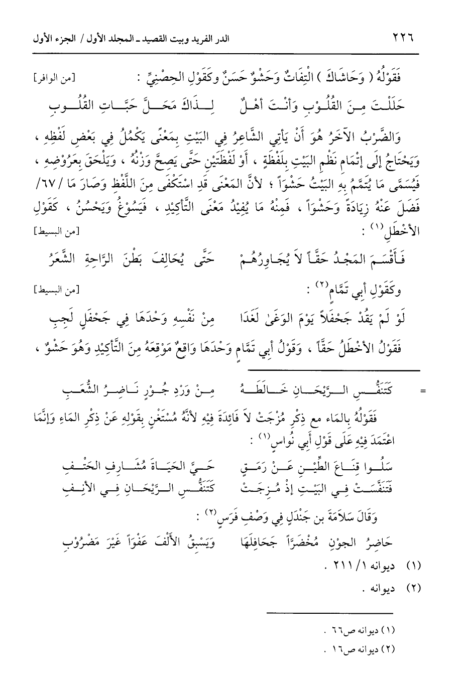 وَالضَّرْبُ الآخَرُ هُوَ أَنْ يَأتِي الشَّاعِرُ فِي البَيْتِ بِمَعْنًى يَكْمُلُ فِي بَعْضِ لَفْظِهِ، وَيَحْتَاجُ إِلَى إتْمَامِ نَظْمِ البَيْتِ بِلَفْظَةٍ، أَوْ لَفْظَتَيْنِ حَتَّى يَصحَّ وَزْنُهُ، وَيَلْحَقَ بِعَرُوْضهِ، فَيُسَمَّى مَا يُتَمَّمُ بِهِ البَيْتُ حَشْوًا؛ لأَنَّ المَعْنَى قَدِ اسْتَكْفَى مِنَ اللَّفْظِ وَصَارَ مَا فَضَلَ عَنْهُ زِيَادَةً وَحَشْوًا، فَمِنْهُ مَا يُفِيْدُ مَعْنَى التَّأكِيْدِ، فَيَسُوْغُ وَيَحْسُنُ، كَقَوْلِ الأخْطَلِ (¬1): [من البسيط]