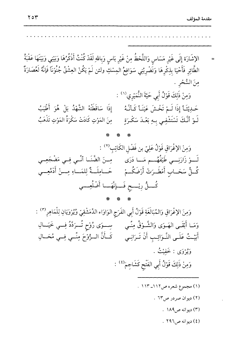 = الإِشَارَة إِلَى غَيْرِ مَسَاسٍ وَاللَّحْظُ مِنْ غَيْرِ بَاسٍ وَبِاللَّهِ لَقَدْ كُنْتُ أَذْكُرُهَا وَبَيْنِي وَبَيْنَهَا عَقْبَةُ الطَّائِرِ فَأَحْيَا بِذِكْرِهَا وَتَضْرِبُنِي سَوَافِعُ المِسْكِ ولئن لَمْ يَكُنْ العِشْقُ جُنُوْنًا فَإِنَّهُ لَعُصَارَةٌ مِنَ السُّحْرِ.