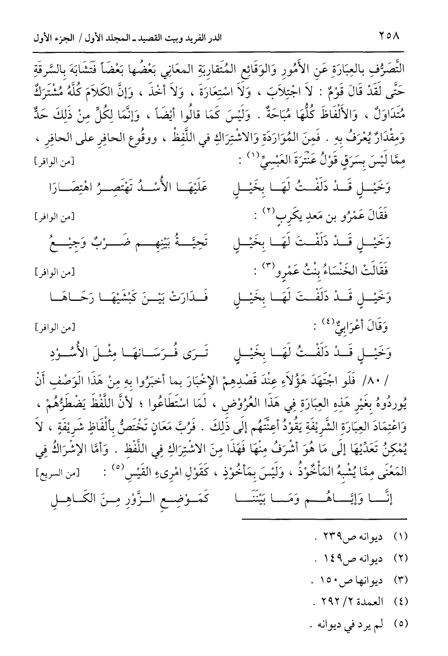 التَّصَرُّفِ بالعِبَارَةِ عَنِ الأَمُورِ وَالوَقَائِعِ المُتَقارِبَةِ المعَانِي بَعْضُها بَعْضًا فَتَشَابَهَ بِالسَّرقَةِ حَتَّى لَقَدْ قَالَ قَوْمٌ: لَا اجْتِلَابَ، وَلَا اسْتِعَارَةَ، وَلَا أخْذَ، وَإنَّ الكَلَامَ كُلَّهُ مُشْتَرَكٌ مُتَدَاوَلٌ، وَالأَلْفَاظَ كُلُّهَا مُبَاحَةٌ. وَلَيْسَ كَمَا قالُوا أَيْضًا، وَإِنَّمَا لِكُلٍّ مِنْ ذَلِكَ حَدٌّ وَمِقْدَار يُعْرَفُ بِهِ. فَمِنَ المُوَارَدَةِ وَالاشْتِرَاكِ في اللَّفِظْ، ووقُوع الحافِرِ على الحافِرِ، مِمَّا لَيْسَ بِسَرَقٍ قَوْلُ عَنْتَرَةَ العَبْسِيِّ (¬1): [من الوافر]