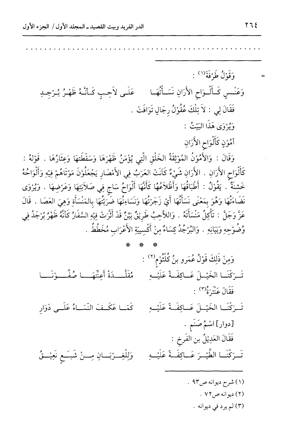 وَقَالَ: وَالأَمُوْنُ المُؤْبقَةُ الخَلْقِ الَّتِي يُؤْمَنُ ظَهْرَهَا وَسَقْطتهَا وَعِثَارُهَا. قَوْلهُ: كَأَلْوَاح الأَرَانِ. الأَرَانِ شَيْءٌ كَانَتْ العَرَبُ فِي الأَمْصَارِ يَجْعَلُوْنَ مَوْتَاهُمْ فِيْهِ وَأَلْوَاحُهُ خَشِنَةٌ. يَقُوْلُ: أَطْبَاقُهَا وَأَظْلَاعُهُا كَأَنَّهَا أَلْوَاحُ سَاجٍ فِي صَلَابَتِهَا وَعَرْضِهَا. وَيُرْوَى نَضَاءَتُهَا وَهُوَ بِمَعْنَى نَسَأْتُهَا أَيْ زَجَرْتُهَا وَنَسَاءِتُهَا ضرَبْتُهَا بِالمَنْسَأَةِ وَهِيَ العَصَا. قَالَ عَزَّ وَجَلَّ: تأْكِلُ مَنْسَأَتَهُ. وَاللَّاحِبُ طَرِيْقٌ بَيِّنٌ قَدْ أَثَّرَتْ فِيْهِ السَّفَارُ كَأَنَّهُ ظَهْرُ بُرْجَدُ فِي وُضُوْحِهِ وَبَيَانِهِ. وَالبُرْجُدُ كِسَاءٌ مِنْ أَكْسِيَةِ الأَعْرَابِ مُخَطَّطٌ.