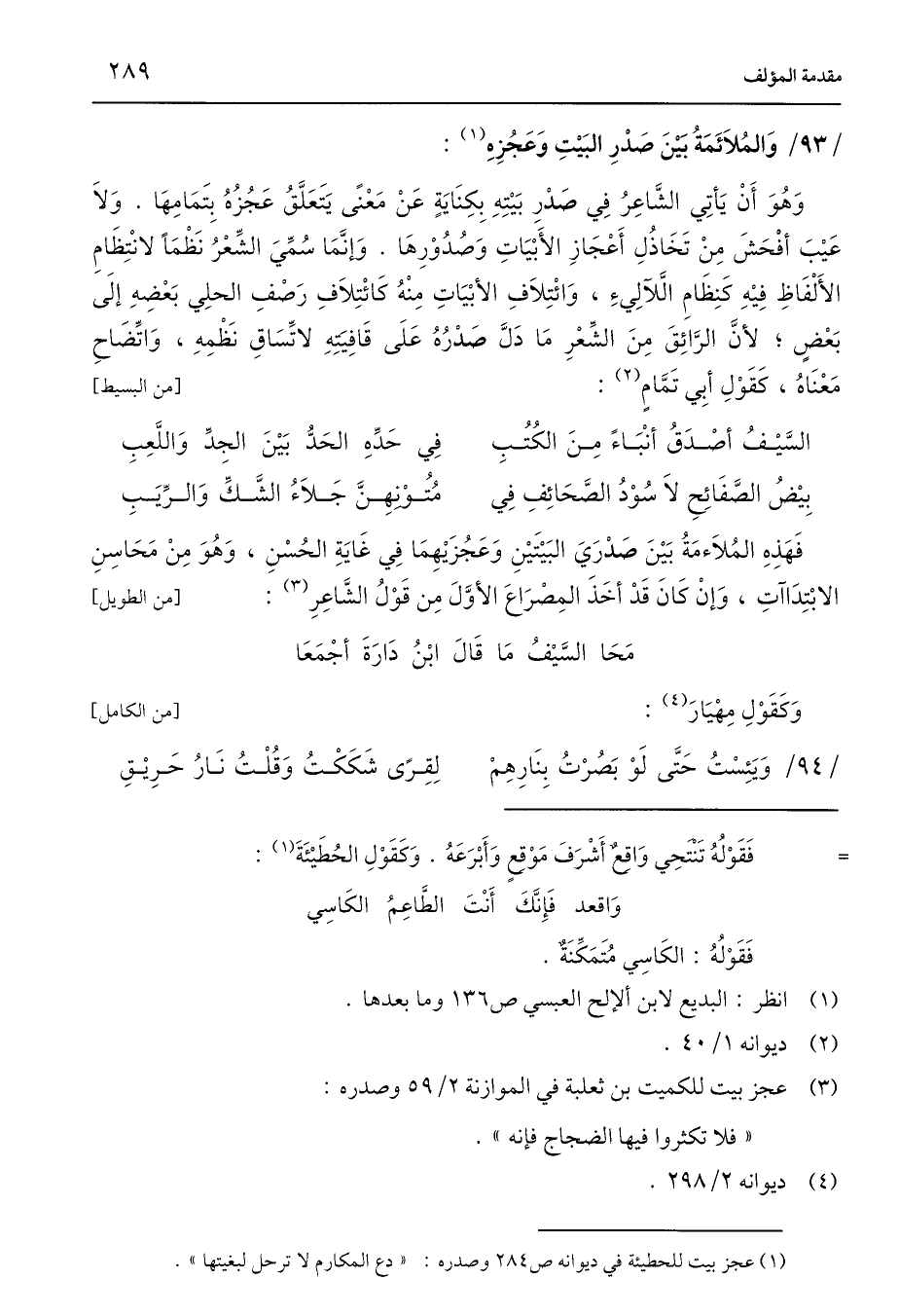 وَهُوَ أَنْ يَأتِي الشَّاعِرُ فِي صَدْرِ بَيْتِهِ بِكِنَايَةٍ عَنْ مَعْنًى يَتَعَلَّقُ عَجُزُهُ بِتَمَامِهَا. وَلَا عَيْبَ أفْحَشَ مِنْ تَخَاذُلِ أَعْجَازِ الأَبْيَاتِ وَصُدُوْرِهَا. وَإِنَّمَا سُمِّيَ الشِّعْرُ نَظْمًا لانْتِظَامِ الأَلْفَاظِ فِيْهِ كَنِظَامِ الَّلآلِيءِ، وَائْتِلَافِ الأبْيَاتِ مِنْهُ كَائْتِلَافِ رَصْفِ الحلِي بَعْضِهِ إِلَى بَعْضٍ، لأنَّ الرَّائِقَ مِنَ الشِّعْرِ مَا دَلَّ صَدْرُهُ عَلَى قَافِيَتِهِ لاتِّسَاقِ نَظْمِهِ، وَاتِّضَاحِ مَعْنَاهُ، كَقَوْلِ أَبِي تَمَّامٍ (¬2): [من البسيط]