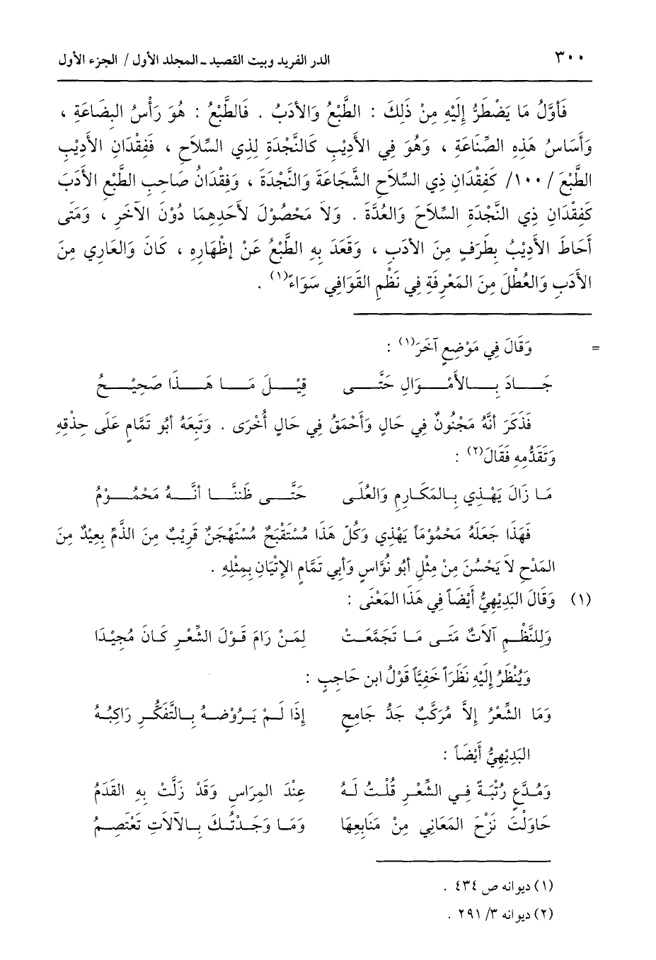 فَأَوَّلُ مَا يَضْطَرُّ إِلَيْهِ مِنْ ذَلِكَ: الطَّبع وَالأدَبُ. فَالطَّبع: هُوَ رَأْسُ البضَاعَةِ، وَأَسَاسُ هَذِهِ الصِّنَاعَةِ، وَهُوَ فِي الأَدِيْبِ كَالنَّجْدَةِ لِذِي السِّلَاحِ، فَفِقْدَانَ الأَدِيْبِ الطَّبع كَفِقْدَانِ ذِي السِّلَاحِ الشَّجَاعَةَ وَالنَّجْدَةَ، وَفِقْدَانُ صَاحِبِ الطَّبع الأَدَبَ كَفِقْدَانِ ذِي النَّجْدَةِ السِّلَاحَ وَالعُدَّةَ. وَلَا مَحْصُوْلَ لأَحَدِهِمَا دُوْنَ الآخَرِ، وَمَتَى أَحَاطَ الأَدِيْبُ بِطَرَفٍ مِنَ الأدَبِ، وَقَعَدَ بِهِ الطَّبع عَنْ إظْهَارِهِ، كَانَ وَالعَارِي مِنَ الأَدَبِ وَالعُطْلَ مِنَ المَعْرِفَةِ فِي نَظْمِ القَوَافِي سَوَاءً (¬1).