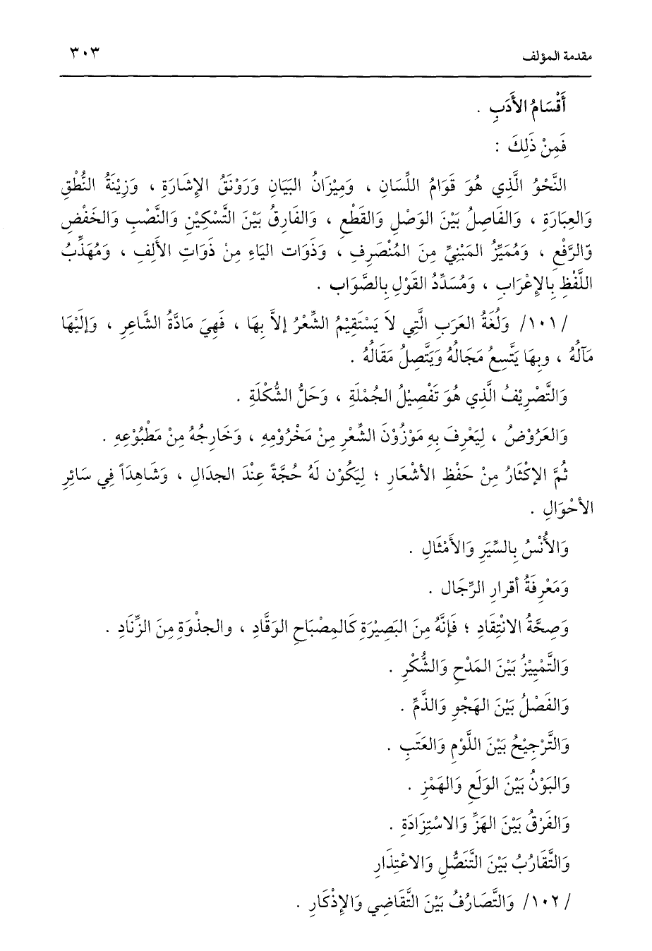 النَّحْوُ الَّذِي هُوَ قَوَامُ اللِّسَانِ، وَمِيْزَانُ البَيَانِ وَرَوْنَقُ الإِشَارَةِ، وَزِيْنَةُ النُّطْقِ وَالعِبَارَةِ، وَالفَاصِلُ بَيْنَ الوَصْلِ وَالقَطْعِ، وَالفَارِقُ بَيْنَ التَّسْكِيْنِ وَالنَّصْبِ وَالخَفْضِ والرَّفْعِ، وَمُمَيِّزُ المَبْنِيِّ مِنَ المُنْصَرِفِ، وَذَوَات اليَاءِ مِنْ ذَوَاتِ الأَلِفِ، وَمُهَذِّبُ اللَّفْظِ بِالإِعْرَابِ، وَمُسَدِّدُ القَوْلِ بِالصَّوَاب.