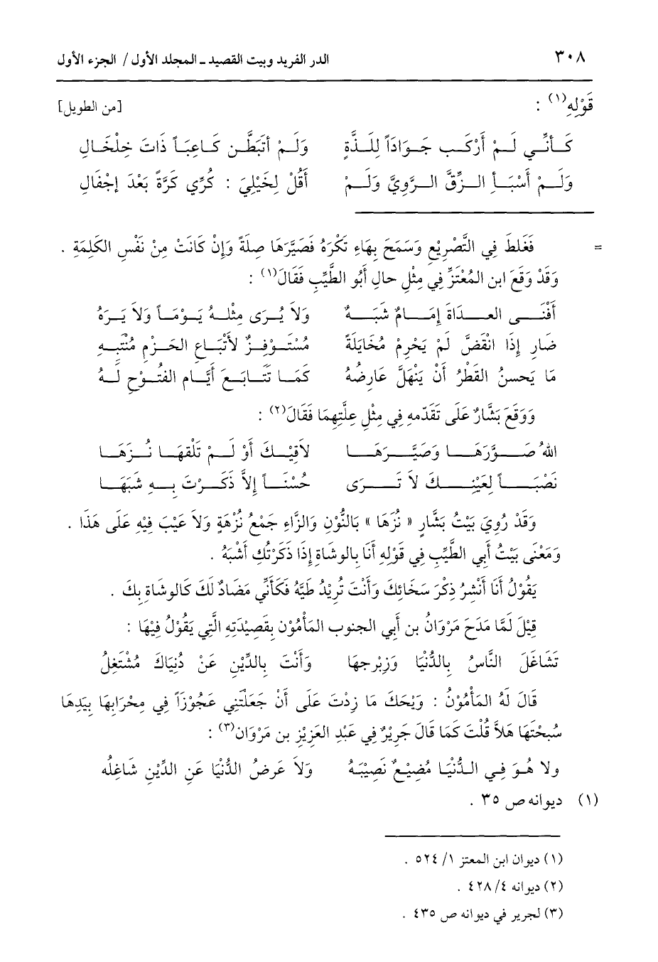 = فَغَلطَ فِي التَّصْرِيْعِ وَسَمَحَ بِهَاءِ تَكْرَهُ فَصَيَّرَهَا صلَةً وَإِنْ كَانَتْ مِنْ نَفْسِ الكَلِمَةِ. وَقَدْ وَقَعَ ابن المُعْتَزِّ فِي مِثْلِ حالِ أَبُو الطَّيِّبِ فَقَالَ (1):