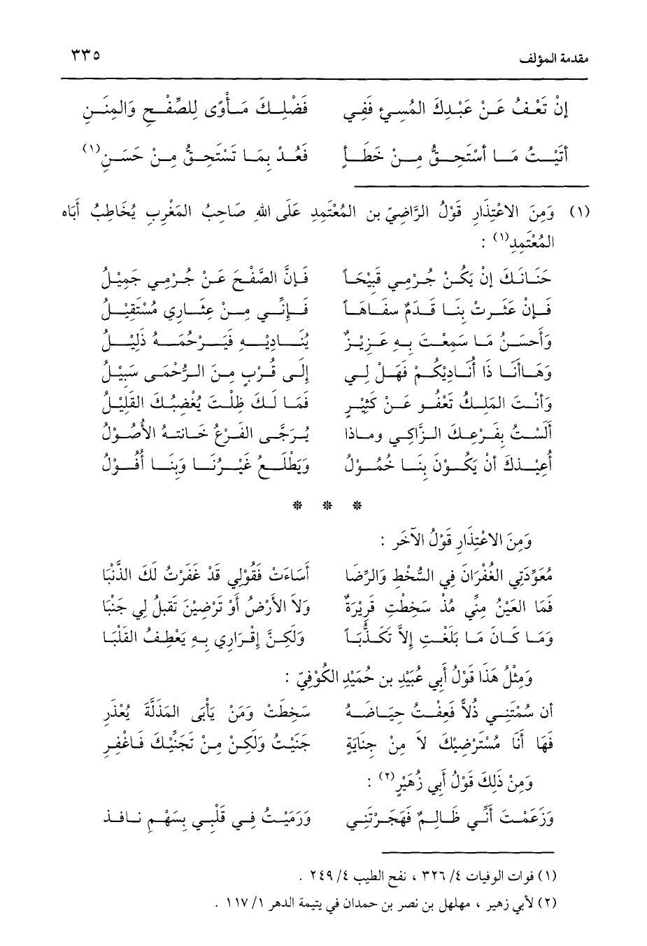 (¬1) وَمِنَ الاعْتِذَارِ قَوْلُ الرَّاضِيّ بن المُعْتَمِدِ عَلَى اللَّهِ صَاحِبُ المَغْرِبِ يُخَاطِبُ أَبَاه المُعْتَمِدِ (1):