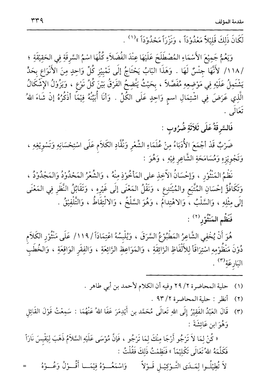 وَيَعُمُّ جَمِيْعَ الأَسْمَاءِ المُصْطَلَحَ عَلَيْهَا عِنْدَ الفُضَلَاءِ كُلِّهَا اسْمُ السَّرِقَةِ فِي الحَقِيْقَةِ؛ لأَنَّهَا جِنْسٌ لَهَا. وَهَذَا البّابُ يَحْتَاجُ إِلَى تَمْيِيْزِ كُلِّ وَاحِدٍ مِنَ الأَنْوَاعِ بِحَدٍّ يَشْتَمِلُ عَلَيْهِ فِي مَوْضِعِهِ مُفَصَّلًا، بِحَيْثُ يَتَّضِحُ الفَرْقُ بَيْنَ كُلِّ نَوْعٍ، وَيَزُوْلُ الإِشْكَالُ الَّذِي عَرَضَ فِي اشْتِمَالِ اسمٍ وَاحِدٍ عَلَى الكُلِّ. وَأَنَا أُبيِّنُهُ فِيْمَا أذْكُرُهُ إِنْ شَاءَ اللَّهُ تَعَالَى.
