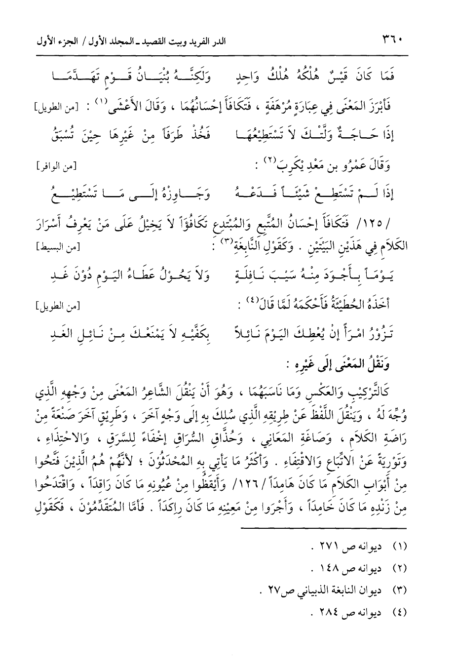 كَالتَّرْكِيْبِ وَالعَكْسِ وَمَا نَاسَبَهُمَا، وَهُوَ أَنْ يَنْقُلَ الشَّاعِرُ المَعْنَى مِنْ وَجْهِهِ الَّذِي وُجِّهَ لَهُ، وَيَنْقُلَ اللَّفْظَ عَنْ طِرِيْقِهِ الَّذِي سُلِكَ بِهِ إِلَى وَجْهٍ آخَرَ، وَطَرِيْقٍ آخَرَ صَنْعَةً مِنْ رَاضَةِ الكَلَامِ، وَصاغَةِ المَعَانِي، وَحُذَّاقِ السُّرَاقِ إخْفَاءً لِلسَّوَقِ، وَالاحْتِذَاءِ، وَتَوْرِيَةً عَنْ الاتِّبَاعِ وَالاقْتِفَاءِ. وَأكْثَرُ مَا يَأتِي بِهِ المُحْدَثُوْنَ؛ لأنَّهُمْ هُمُ الَّذِيْنَ فَتَّحُوا مِنْ أَبْوَابِ الكَلَامِ مَا كَانَ هَامِدًا وَأَيْقَظُوا مِنْ عُيُونهِ مَا كَانَ رَاقِدًا، وَاقْتَدَحُوا مِنْ زَنْدِهِ مَا كَانَ خَامِدًا، وَأَجْرَوا مِنْ مَعِيْنِهِ مَا كَانَ راكِدًا. فَأَمَّا المُتَقَدِّمُوْنَ، فَكَقَوْلِ