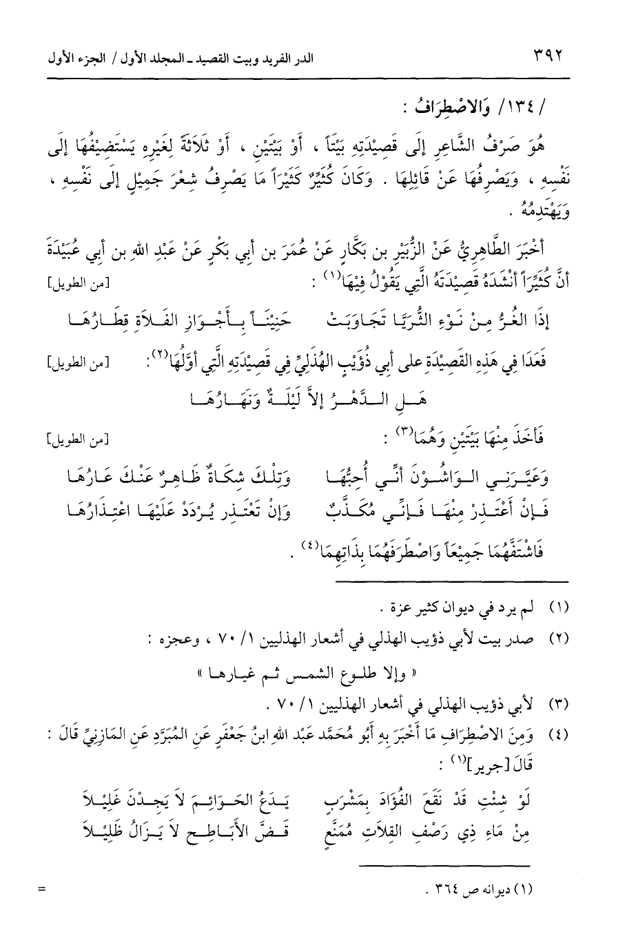 (¬4) وَمِنَ الاصْطِرَافِ مَا أَخْبَرَ بِهِ أَبُو مُحَمَّد عَبْد اللَّهِ ابْنُ جَعْفَرٍ عَنِ المُبَرَّدِ عَنِ المَازِنيِّ قَالَ: قَالَ [جرير] (1):