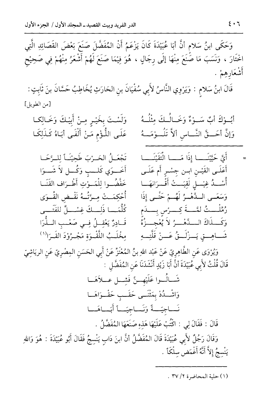 وَيُرْوَى عَنِ الطَّاهِرِيّ عَنْ عَبْد اللَّهِ بنُ المُعْتَزِّ عَنْ أَبِي الحَسَنِ المِصرِيّ عَنِ الريَاشِيّ قَالَ قُلْتُ لِأبي عُبَيْدَةَ أَنَّ أَبَا زَيْدٍ أَنْشَدَنَا عَنِ المُفَضَّلِ: