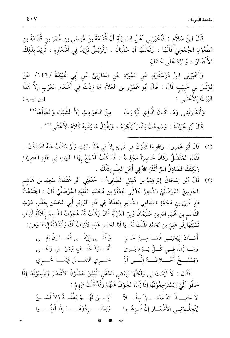 (¬1) قَالَ أَبُو عَمْرو: وَاللَّهِ مَا كَذَبْتُ فِي شَيْءٍ إِلَّا فِي هَذَا البَيْتِ وَلَوْ سُئُلْتُ عَنْهُ لَصَدَقْتُ. فَقَالَ المُفَضَّلُ وَكَانَ حَاضرًا مَجْلِسهُ: قَدْ كُنْتُ أَسْمَعُ بِهَذا البَيْتِ فِي هَذِهِ القَصيْدَةِ وَلَكِنَّكَ الصادِقُ البَرُّ أَكْثَرَ اللَّهُ فِي أَهْلِ العِلْمِ مِثْلَكَ.
