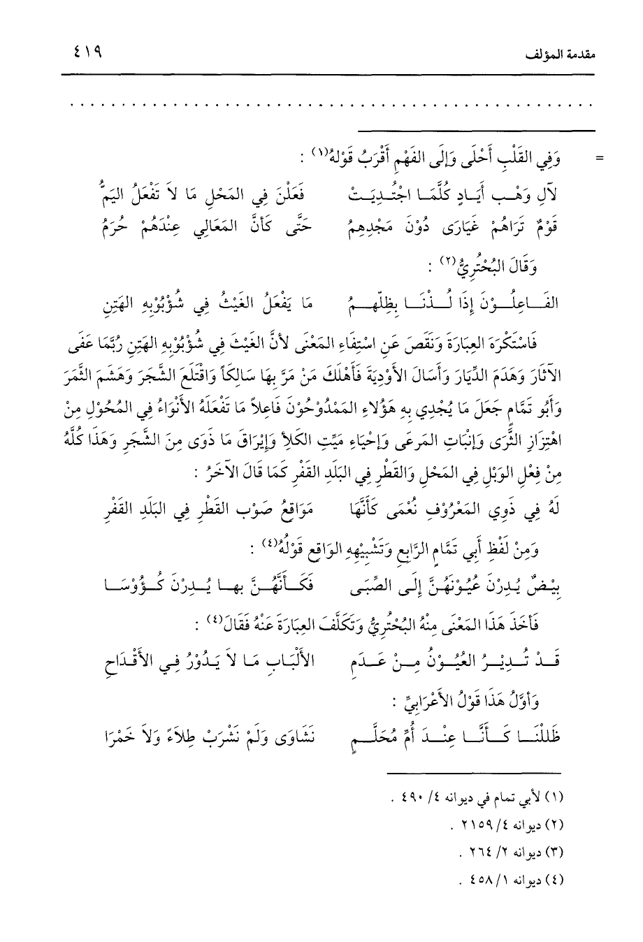 فَاسْتَكْرَهَ العِبَارَةَ وَنَقَصَ عَنِ اسْتِفَاءِ المَعْنَى لأنَّ الغَيْثَ فِي شُؤْبُوْبِهِ الهَتِنِ رُبَّمَا عَفَى الآثَارَ وَهَدَمَ الدِّيَارَ وَأَسَالَ الأَوْدِيَةَ فَأَهْلَكَ مَنْ مَرَّ بِهَا سَالِكًا وَاقْتَلَعَ الشَّجَرَ وَهَشَمَ الثَّمَرَ وَأَبُو تَمَّامٍ جَعَلَ مَا يُجْدِي بِهِ هَؤُلاءِ المَمْدُؤحُوْنَ فَاعِلًا مَا تَفْعَلَهُ الأَنْوَاءُ فِي المُحُوْلِ مِنْ اهْتِزَازِ الثَّرَى وإِنْبَاتِ المَرعَى وإِحْيَاءِ مَيِّتِ الكَلِأ وَإِيْرَاقَ مَا ذَوَى مِنَ الشَّجَرِ وَهَذَا كُلَّهُ مِنْ فِعْلِ الوَبْلِ فِي المَحْلِ وَالقَطْرِ فِي البَلَدِ القَفْرِ كَمَا قَالَ الآخَرُ: