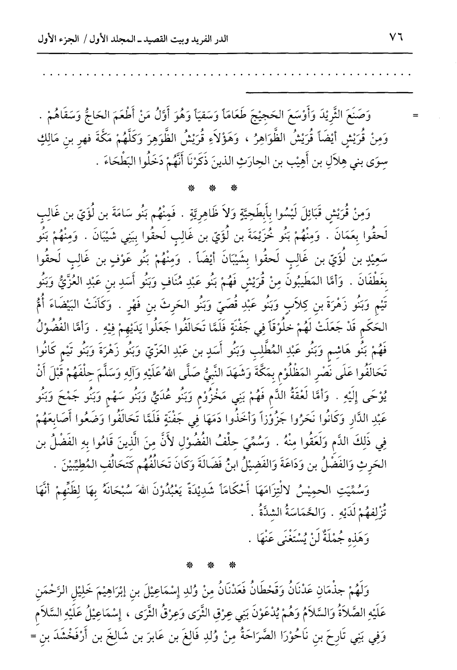 وَمِنْ قُرَيْشٍ قَبَائِلَ لَيْسُوا بِأَبِطَحِيَّةٍ وَلَا ظَاهِرِيَّةٍ. فَمِنْهُم بَنُو سَامَةَ بن لُؤَيّ بن غَالِبٍ لَحقُوا بِعَمَانَ. وَمِنْهُمْ بَنُو خُزَيْمَةَ بن لُؤَيّ بن غَالِبٍ لَحقُوأ بِبَنِي شَيْبَانَ. وَمِنْهُمْ بَنُو سَعِيْدٍ بن لُؤَيّ بن غَالِبٍ لَحقُوا بِشَيْبَانَ أيْضًا. وَمِنْهُمْ بَنُو عَوْفٍ بن غَالِبٍ لَحقُوا بِغَطْفَانَ. وَأمَّا المَطَيبُونَ مِنْ قُرَيْشٍ فَهُمْ بَنُو عَبْدِ مُنَافٍ وَبَنُو أَسَدِ بنِ عَبْدِ العُزَّيُّ وَبَنُو تَيْمِ وَبَنُو زَهْرَةَ بنِ كِلَابٍ وَبَنُو عَبْدِ قُصَيّ وَبَنُو الحَرِثَ بنِ فَهْرٍ. وَكَاَنَتْ البَيْضَاءَ أُمُّ الحَكَمِ قَدْ جَعَلَتْ لَهُمْ خلُوْقًا فِي جَفْنَةٍ فَلَمَّا تَحَالَفُوا جَعَلُوا يَدَيْهِمْ فِيْهِ. وَأمَّا الفُضُوْلُ فَهُمْ بَنُو هَاشِمٍ وَبَنُو عَبْدِ المُطَّلِبِ وَبَنُو أَسَدٍ بن عَبْدِ العَزّيّ وَبَنُو زَهْرَةَ وَبَنُو تَيْمٍ كَانُوا تَحَالَفُوا عَلَى نَصْرِ المَظْلُوْمِ بِمَكَّةَ وَشَهَدَ النَّبِيُّ صَلَّى اللَّهُ عَلَيْهِ وَآلِهِ وَسَلَّمَ حِلْفَهُمْ قَبْلَ أَنْ يُوْحَى إِلَيْهِ. وَأمَّا لَعْقَةُ الدَّمِ فَهُمْ بَنِي مَخْزُوْمٍ وَبَنُو عُدَيٍّ وَبَنُو سَهْمٍ وَبَنُو جَمْحَ وَبَنُو عَبْدِ الدَّارِ وَكَانُوا نَحَرُوا جَزُوْزًا وَأخَذُوا دَمَهَا فِي جَفْنَةٍ فَلَمَّا تَحَالَفُوا وَضعُوا أَصَابِعَهُمْ فِي ذَلِكَ الدَّمِ وَلَعَقُوا مِنْهُ. وَسُمِّيَ حِلْفُ الفُضُوْلِ لأَنَّ مِنَ الَّذِينَ قَامُوا بِهِ الفَضْلُ بن الحَرِثِ وَالفَضْلُ بن وَدَاعَةَ وَالفَضِيْلُ ابنُ فَضالَةَ وَكَانَ تَحَالُفُهُم كَتَحَالُفِ المُطِيِّبيْنَ.