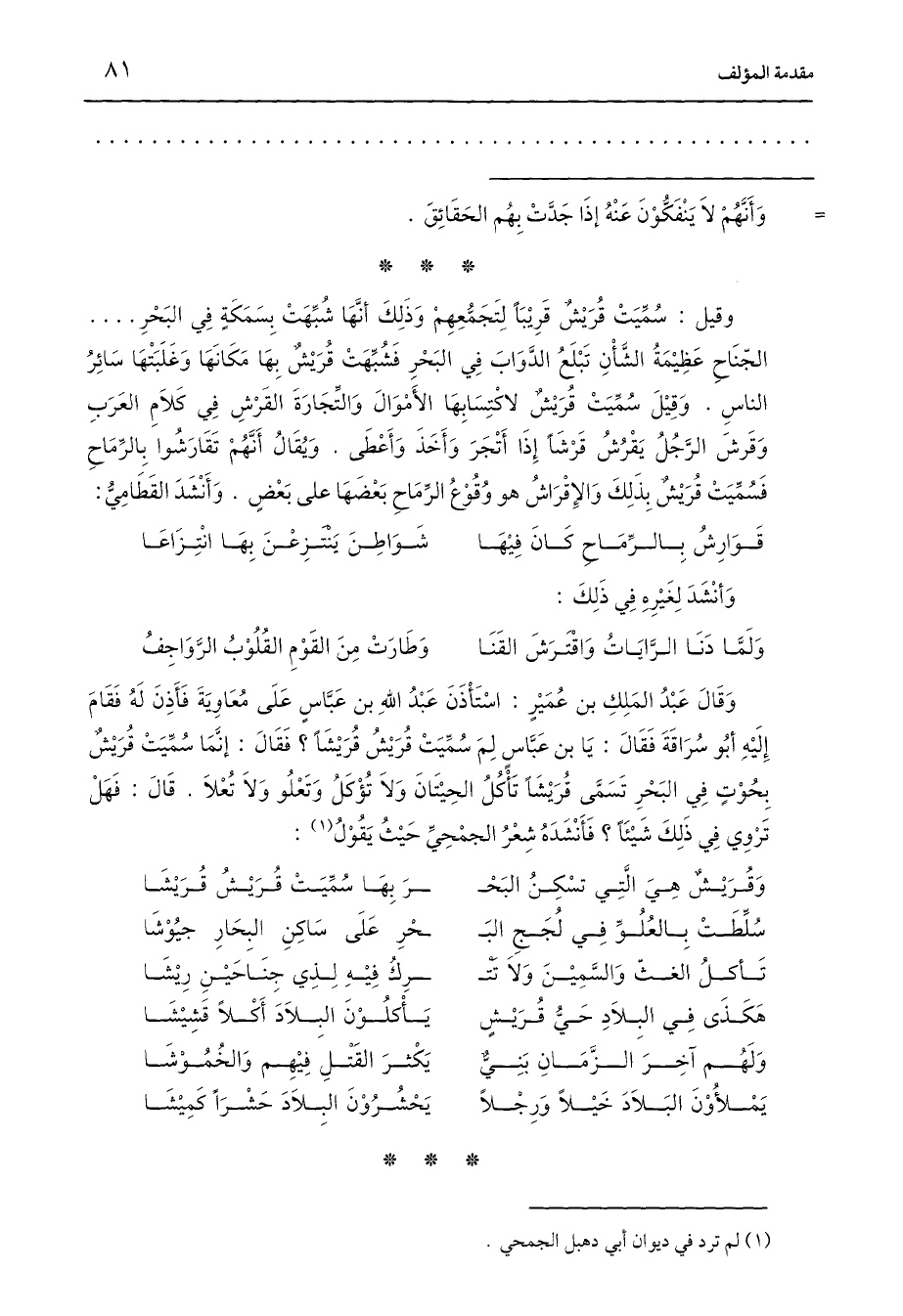 وَقُرَيْشٌ هِيَ الَّتِي تسْكِنُ البَحْـ ... ـرَ بِهَا سُمِّيَتْ قُرَيْشُ قُرَيْشَا
