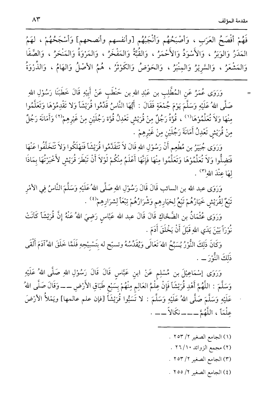 وَرَوَى جُبَيْرُ بن مُطْعِم أَنْ رَسُوْلِ اللَّهِ قَالَ لَا تَتَقَدَّمُوا قُرَيْشًا فَتَهْلَكُوا وَلَا تَتَخَلَّفُوا عَنْهَا فَتَضِلُّوا وَلَا تُعَلِّمُوْهَا وَتَعَلَّمُوا مِنْهَا فَإِنَّهَا أَعْلَمُ مِنْكُمْ لَوْلَا أَنْ تَبْطَرَ قُرَيْشٍ لأَخْبَرْتُهَا بِمَاذَا لِهَا عِنْدَ اللَّهِ (3).